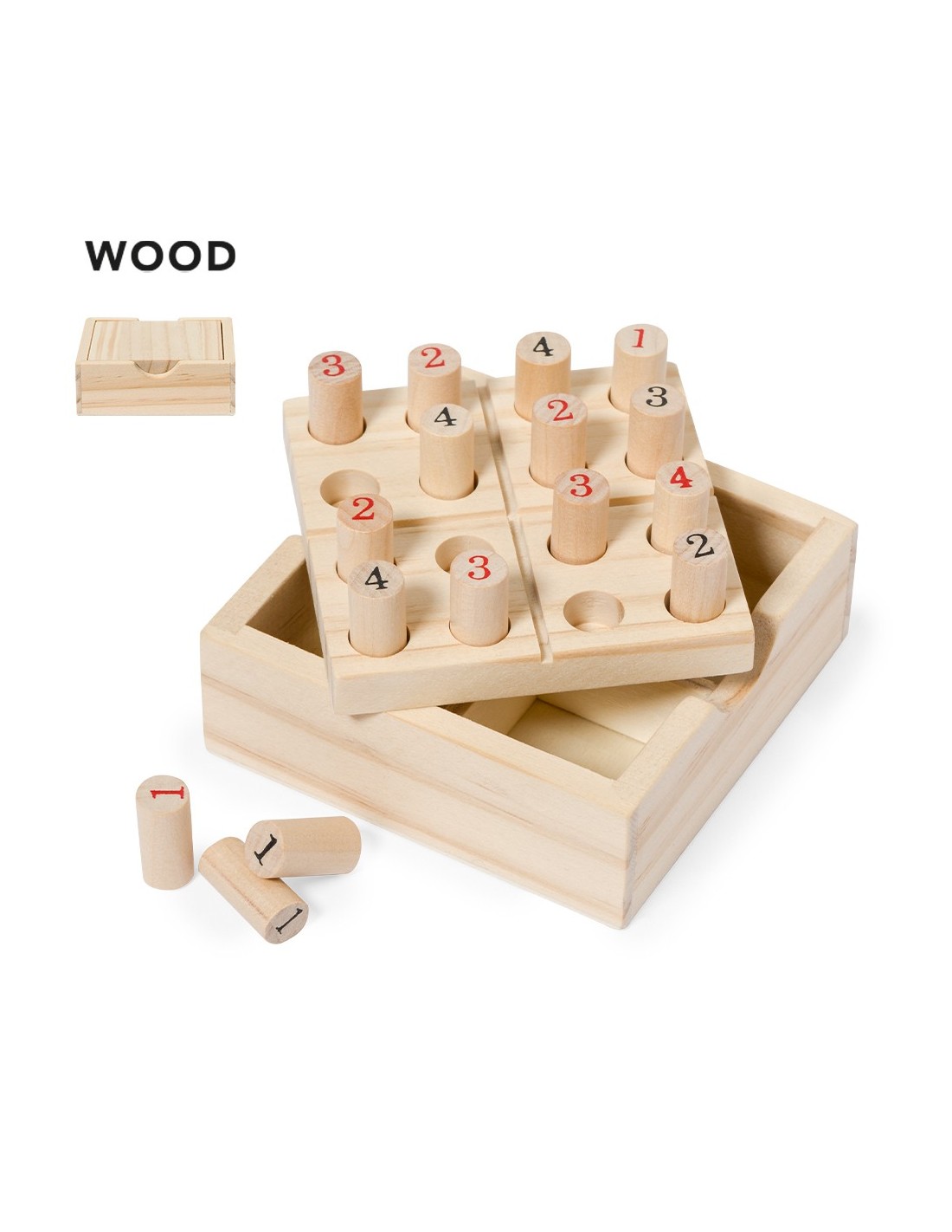 Juego de habilidad sudoku fabricado en suave madera. Incluye 16 fichas de madera numeradas, en estuche de madera con tapa-tablero. Con reglas del juego en español e inglés. Presentado individualmente en caja de diseño kraft.