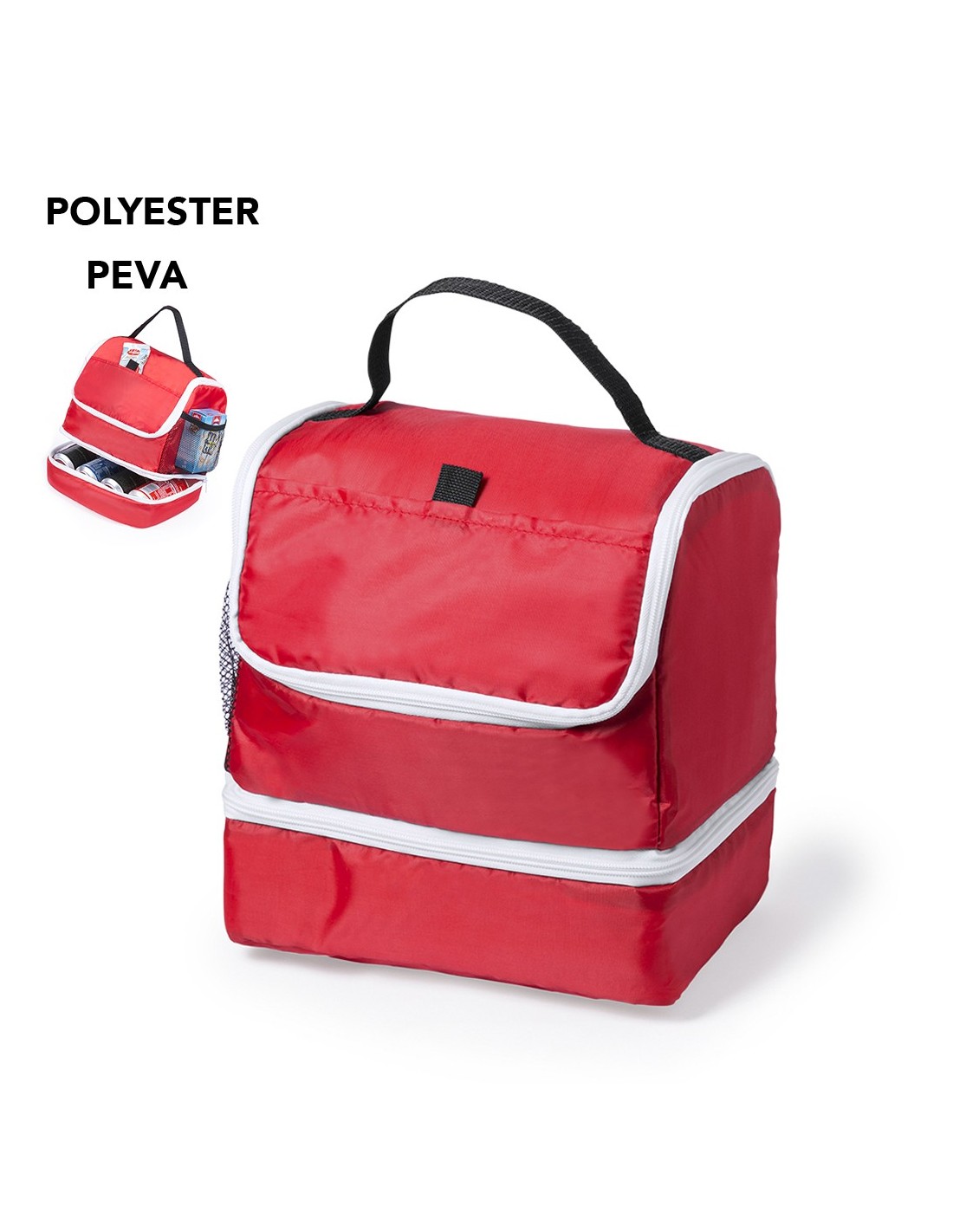 Nevera todoterreno en poliéster 210D de vivos colores y con dos compartimentos independientes con cierre de cremallera. Con bolsillo frontal de cierre de velcro y bolsillo de redecilla elástica en lateral. Interior isotermo en acabado PEVA. Con práctica a