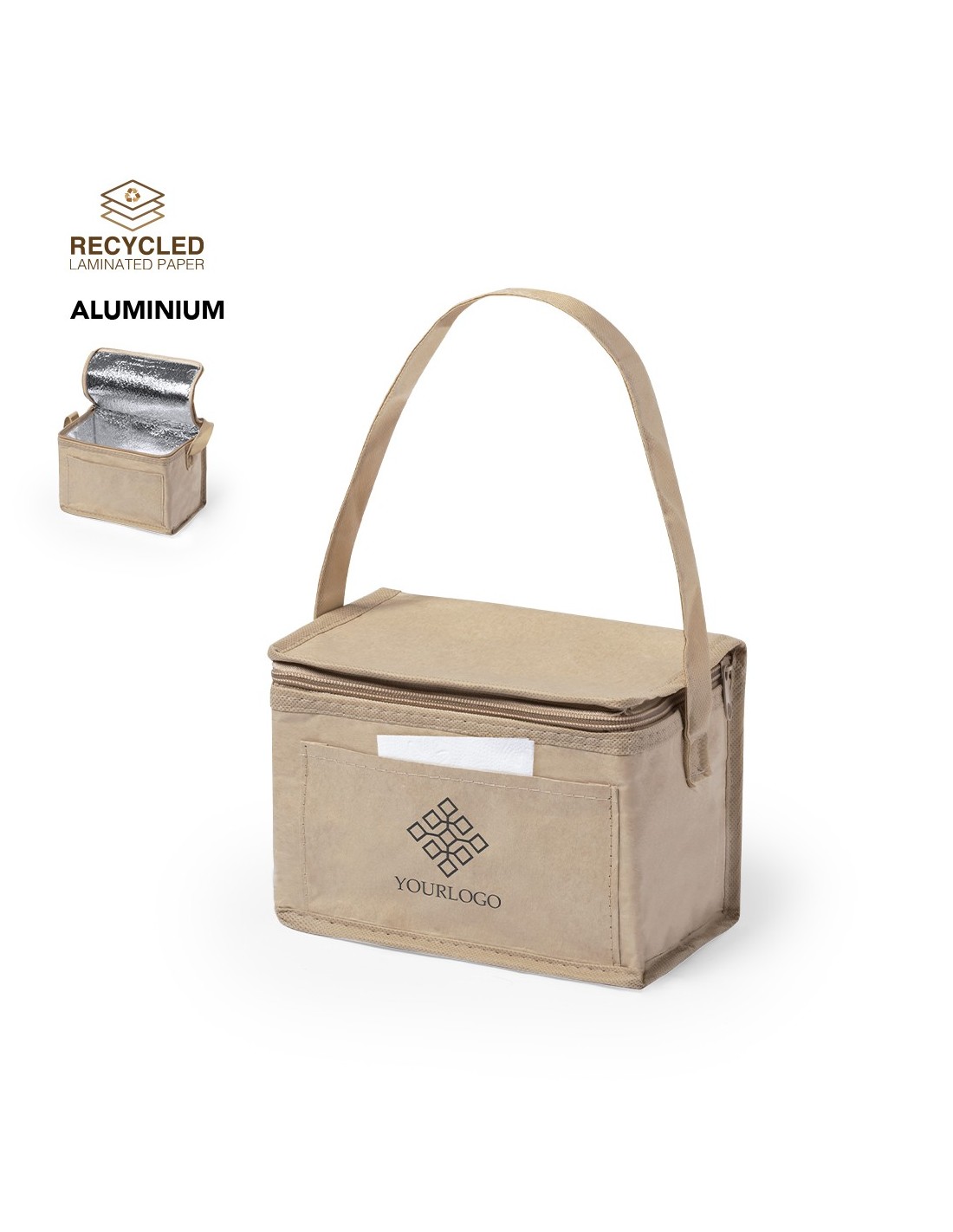 Nevera de línea nature con capacidad para 6 latas. Fabricada en papel laminado resistente a la humedad, con interior isotermo acabado en aluminio. Cremallera y asa de transporte a juego, con bolsillo exterior para marcaje.