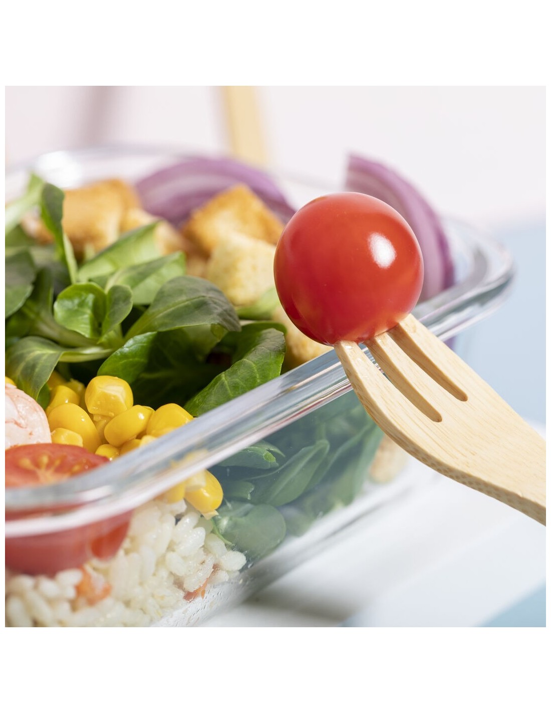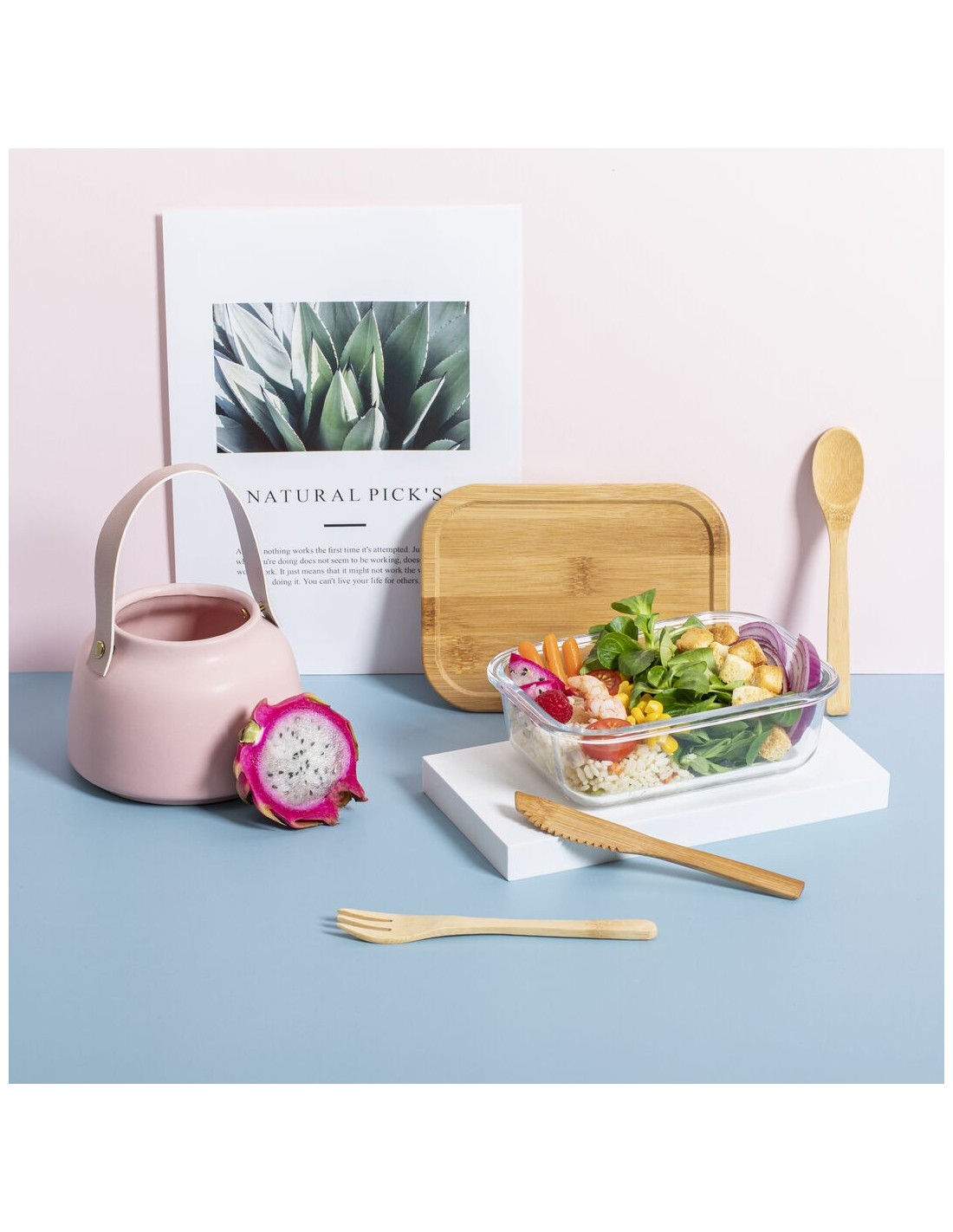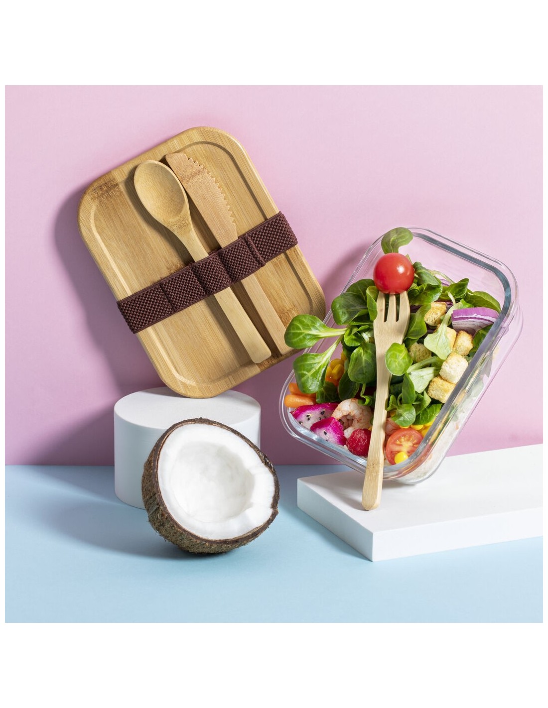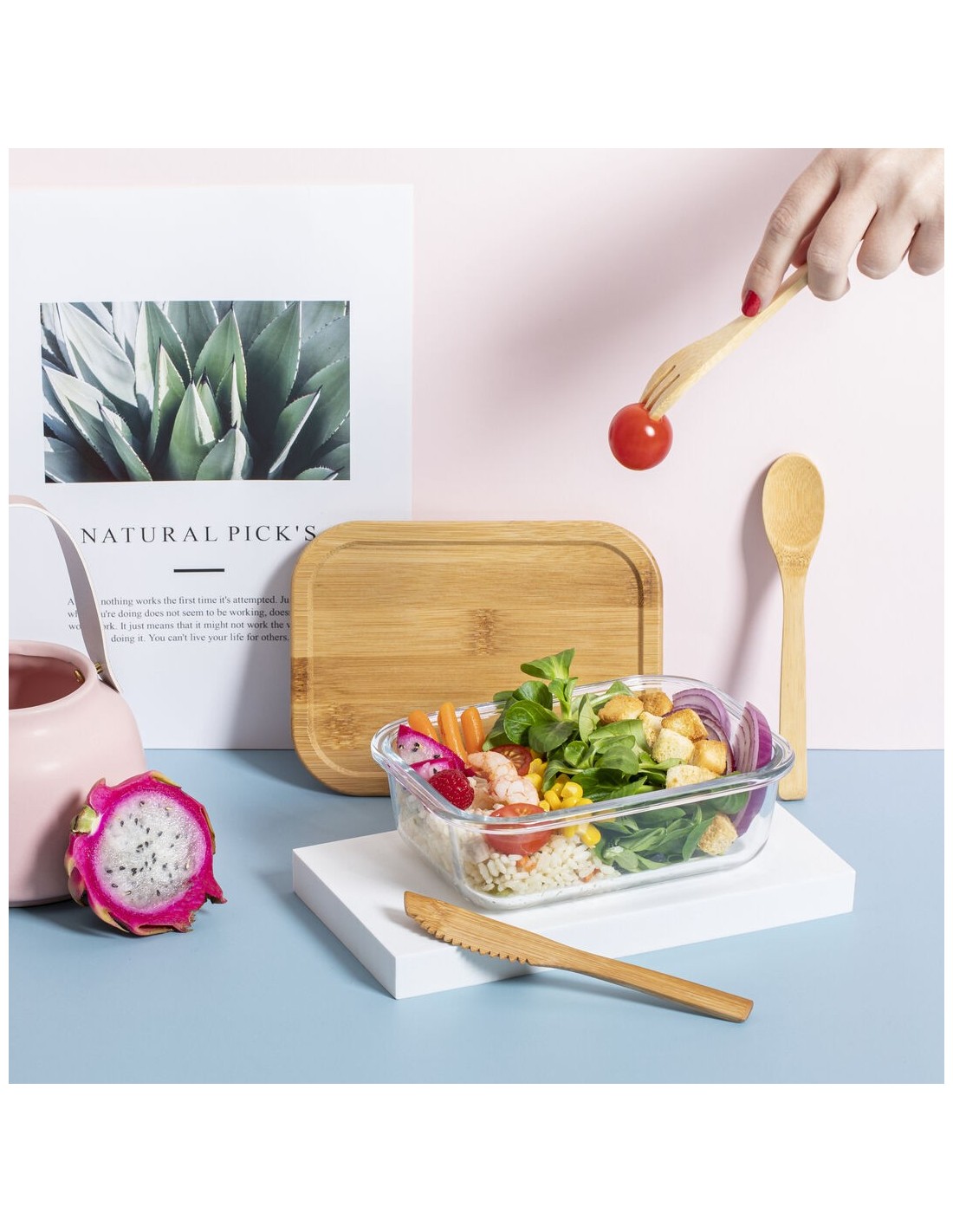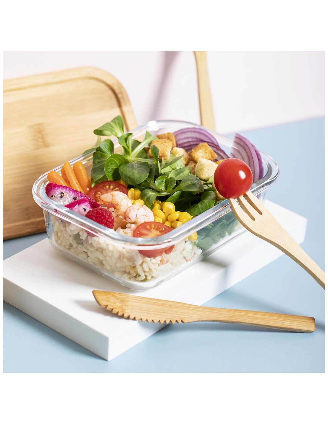 Fiambrera de línea nature de 700 ml de capacidad. Fabricada en cristal, con tapa hermética de bambú pulido, con banda de goma para evitar derrames y rebaje para usarla como bandeja. Incluye cinta de seguridad con tenedor, cuchara y cuchillo. Presentada en atractiva caja individual de diseño eco.