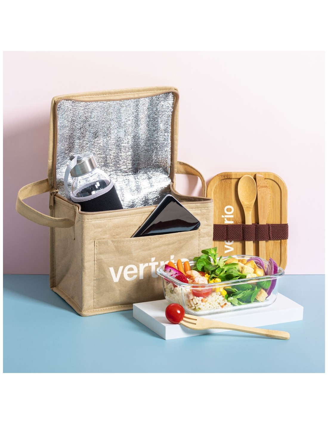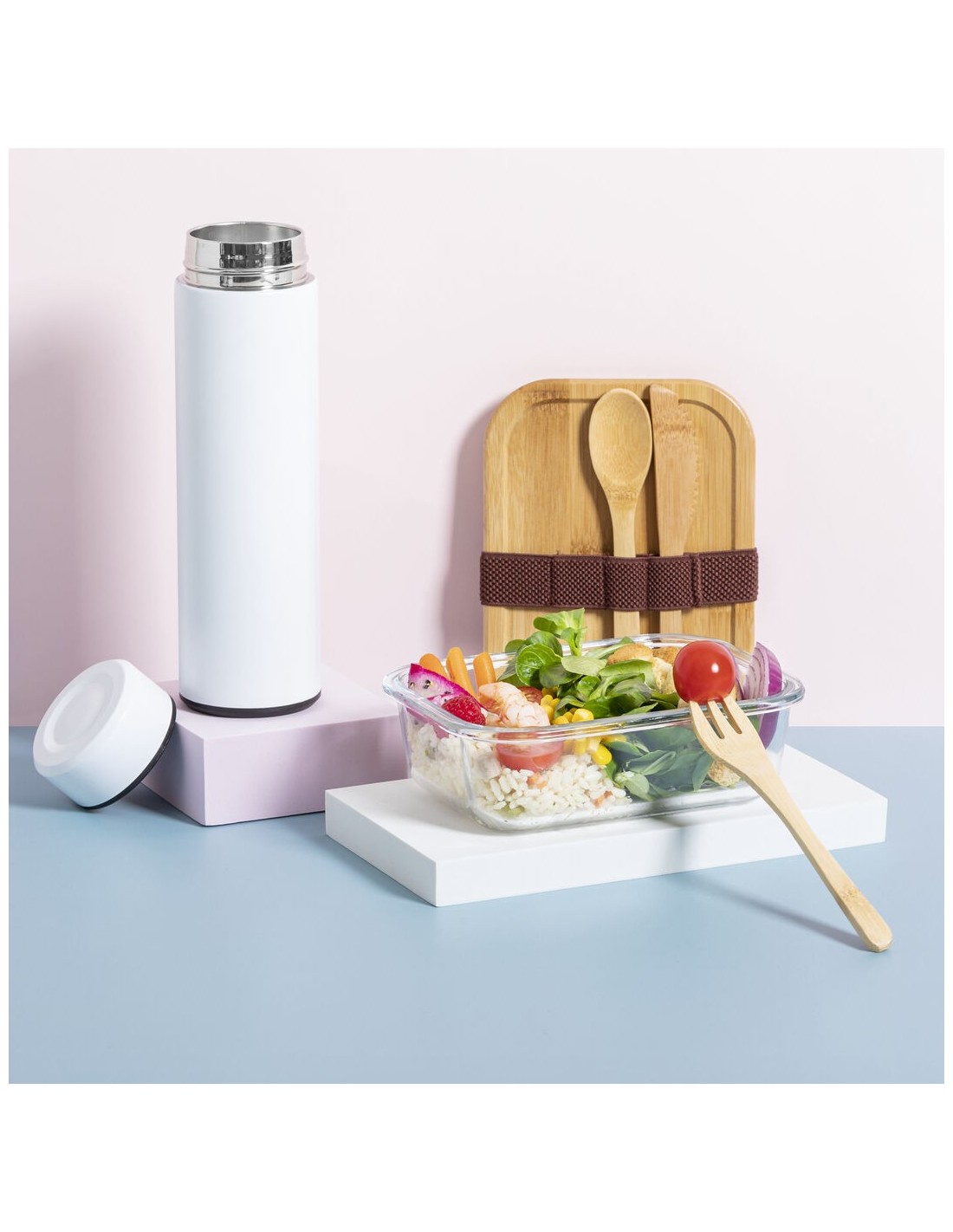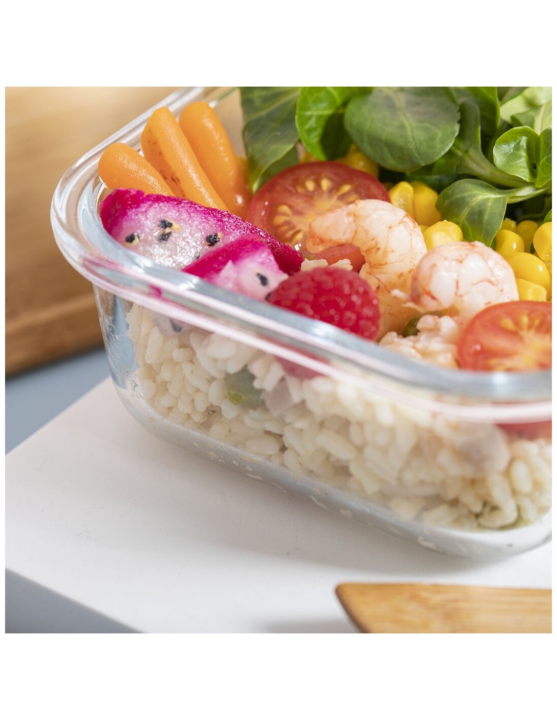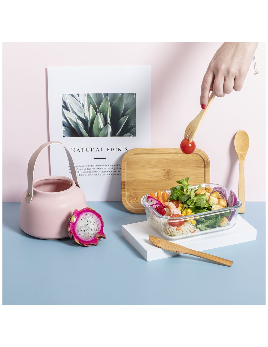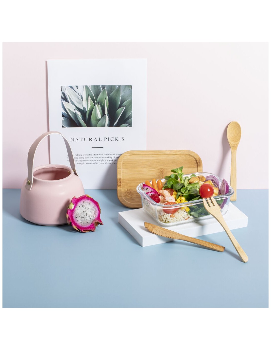 Fiambrera de línea nature de 700 ml de capacidad. Fabricada en cristal, con tapa hermética de bambú pulido, con banda de goma para evitar derrames y rebaje para usarla como bandeja. Incluye cinta de seguridad con tenedor, cuchara y cuchillo. Presentada en atractiva caja individual de diseño eco.