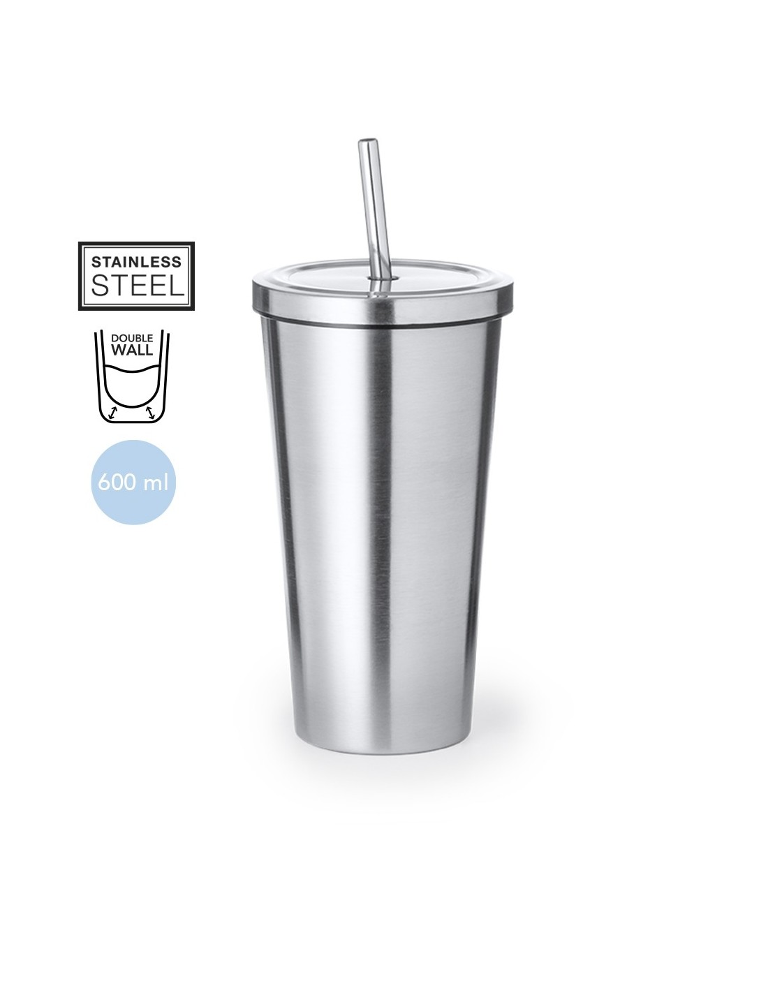 Elegante vaso térmico de acero inoxidable de doble pared y 600 ml de capacidad. De acabado mate, con tapa a rosca y pajita a juego. Presentado en caja individual de diseño kraft.