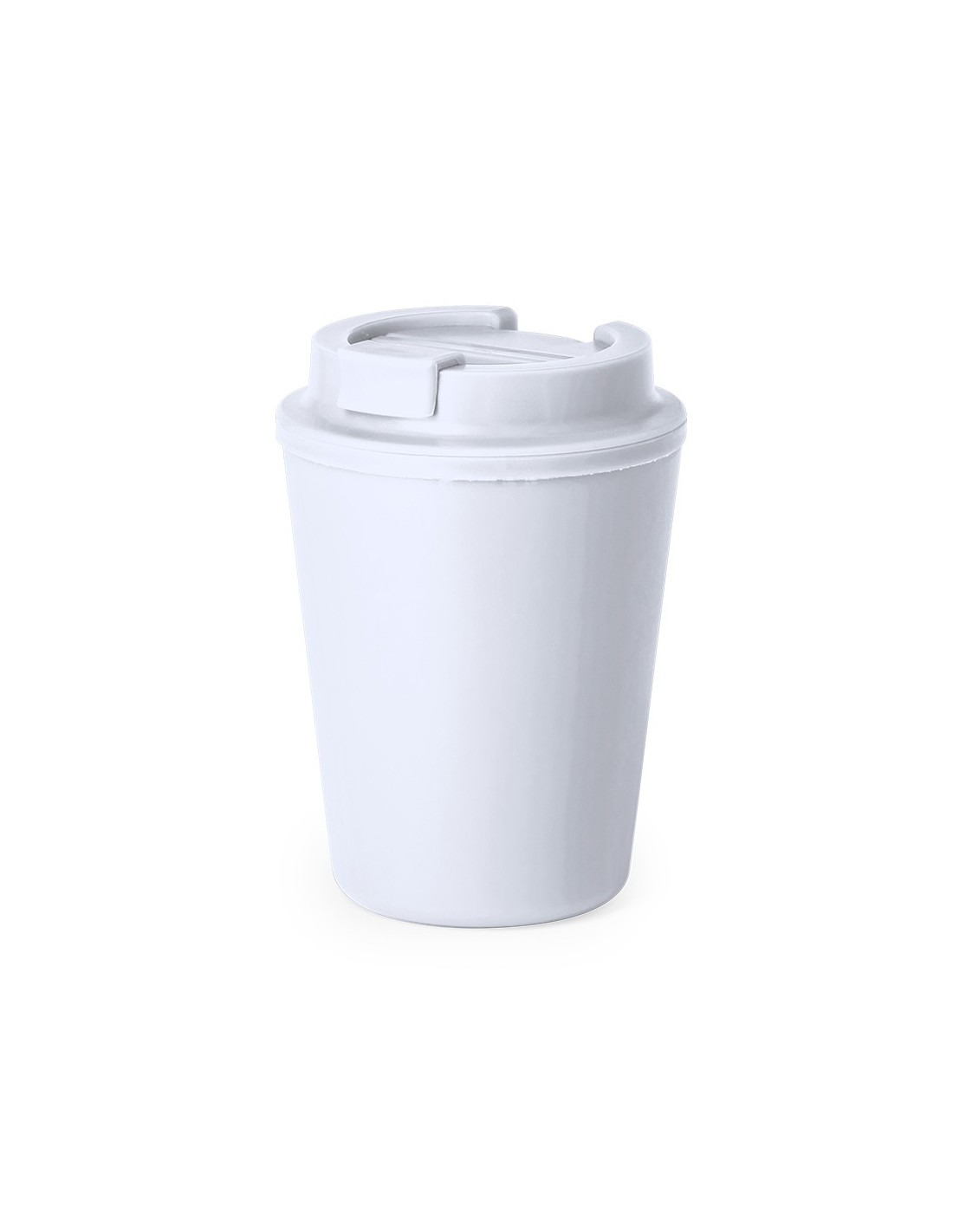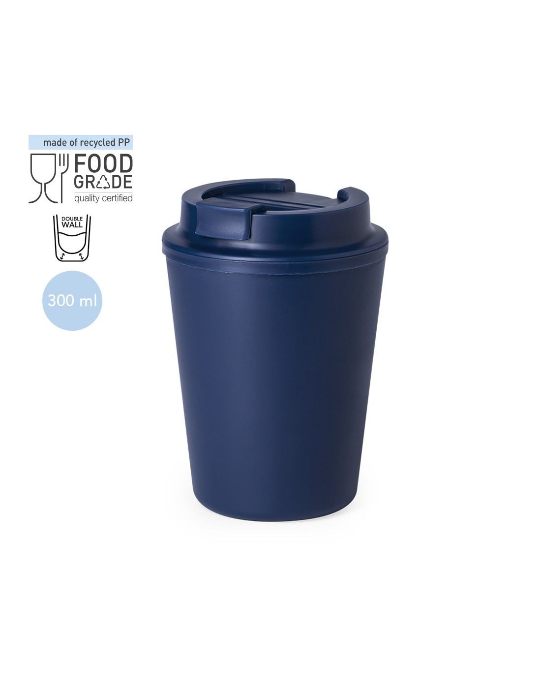 Vaso térmico fabricado en resistente PP de doble pared y 300ml de capacidad. Tapa de seguridad con dosificador y abre fácil, libre de BPA. Con certificación Food Grade, garantizando la seguridad cuando los alimentos entran en contacto con el material usado para fabricar el producto. De acabado mate y disponible en variada gama de colores. Presentado en bolsa individual reciclada. El PP reciclado es un plástico reciclado y altamente reciclable, de gran resistencia y apto para multitud de aplicaciones.