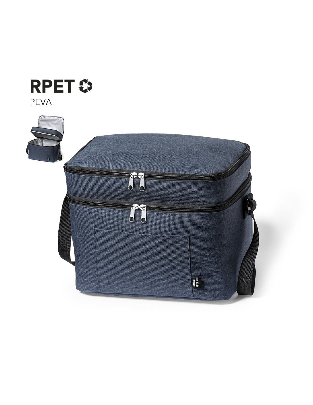 Nevera fabricada en resistente 600D RPET. Incluye 2 compartimentos independientes, con cierre de cremallera y doble tirador metálico. Interior isotermo en PEVA, con cinta bandolera ajustable y bolsillo exterior. Disponible en variada gama de colores, con etiqueta exterior con distintivo RPET. El material RPET se elabora a partir de plástico reciclado, para así fomentar la reutilización de residuos plásticos y ayudar a la sostenibilidad del planeta.