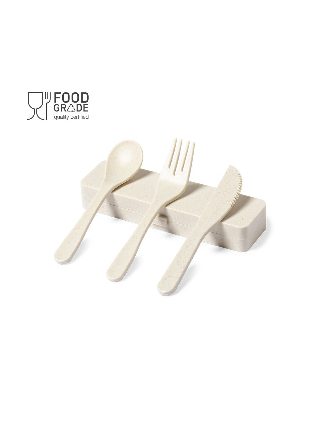 Set de cubiertos fabricados en PP de acabado veteado, libre de BPA, con estuche de presentación a juego. Incluye cuchara, tenedor y cuchillo. Certificación Food Grade, garantizando la seguridad cuando los alimentos entran en contacto con el material usado para fabricar el producto.
