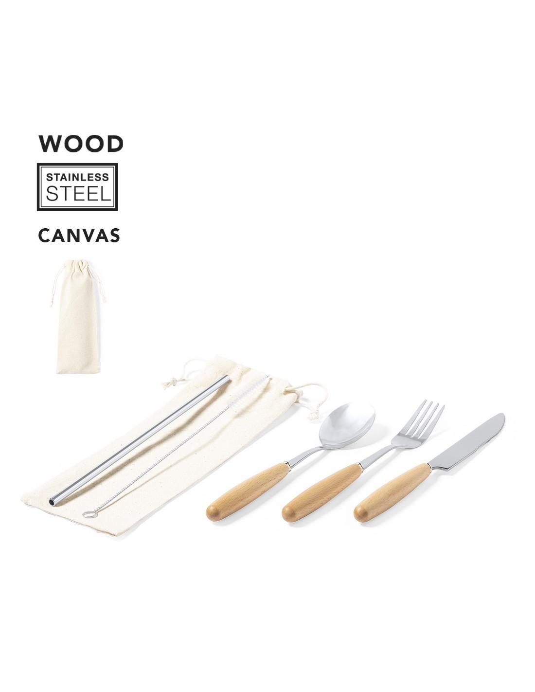 Set de cubiertos de 5 piezas fabricados en acero inox, con mango en madera natural. Incluye cuchara, tenedor, cuchillo, pajita reutilizable y cepillo limpiador para la pajita. Presentación en funda de algodón natural con cordón de cierre.