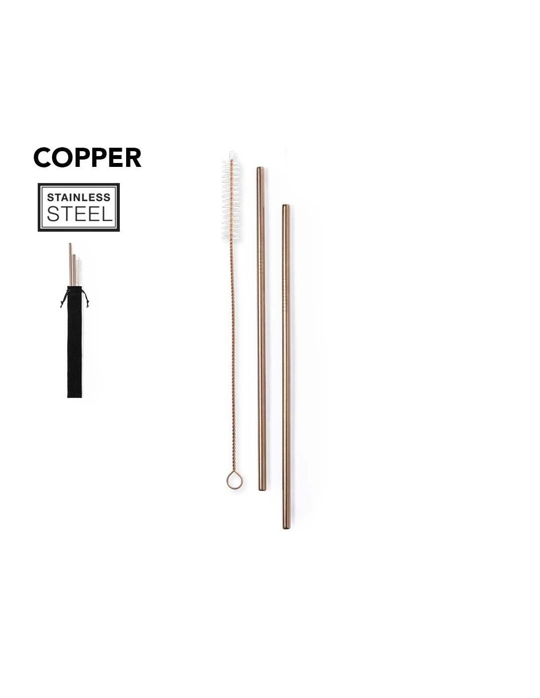 Set de pajitas de 2 piezas fabricadas en acero inox con recubrimiento exterior de cobre galvanizado. Con cepillo limpiador incluido y presentadas en funda de antelina negra con cordón de cierre.