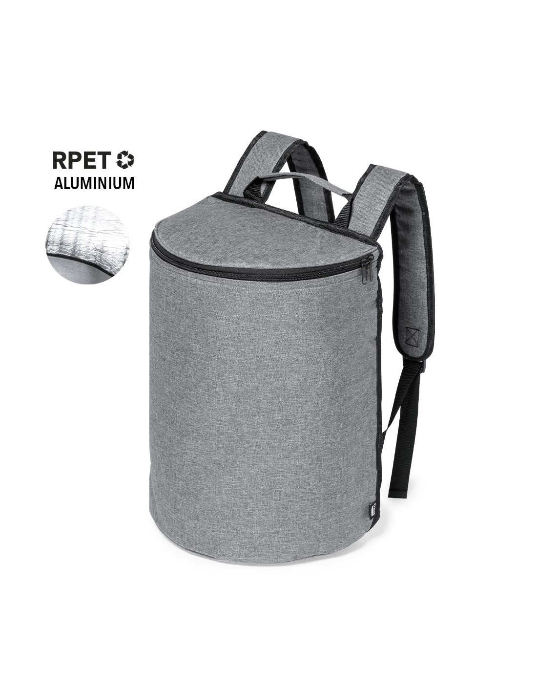 Mochila nevera fabricada en resistente 600D RPET. Acabado en color gris, con asa de transporte. Cintas para hombros acolchadas y ajustables. Compartimento principal con cierre de cremallera y tiradores metálicos. Interior isotermo en aluminio y etiqueta exterior con distintivo RPET. El material RPET se elabora a partir de plástico reciclado, para así fomentar la reutilización de residuos plásticos y ayudar a la sostenibilidad del planeta.
