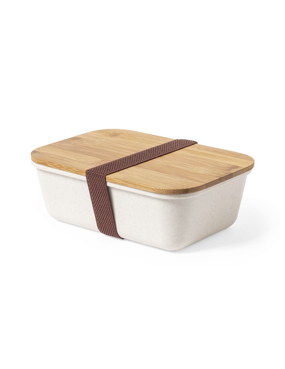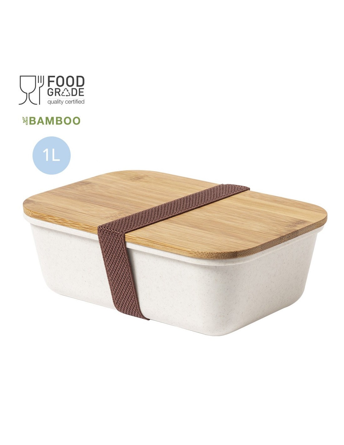 Fiambrera de 1l en resistente material PP veteado libre de BPA, con tapa de bambú. Cinta elástica de seguridad en tapa y certificación Food Grade, garantizando la seguridad cuando los alimentos entran en contacto con el material usado para fabricar el producto.