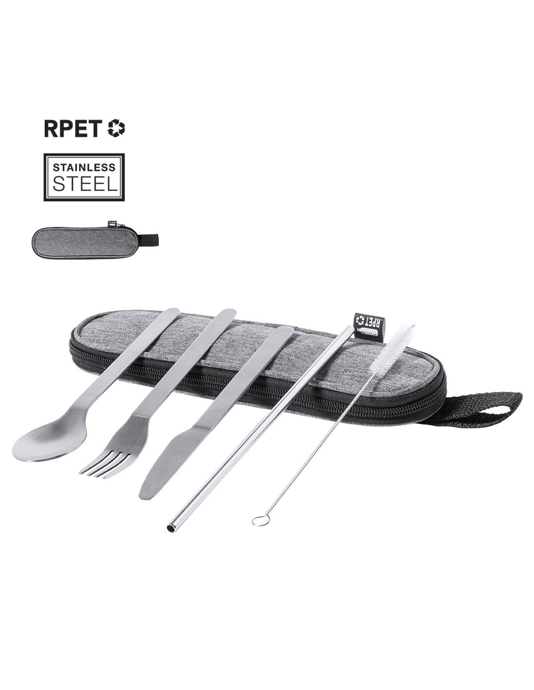 Set de cubiertos reutilizables fabricados en resistente y duradero acero inox. Incluye cuchara, cuchillo, tenedor, pajita y accesorio de limpieza. Presentados en elegante estuche individual de poliéster 300D RPET, elaborado a partir de plástico reciclado para así fomentar la reutilización de residuos plásticos y ayudar a la sostenibilidad del planeta. Estuche con cinta de transporte, cierre de cremallera y distintivo RPET en etiqueta.