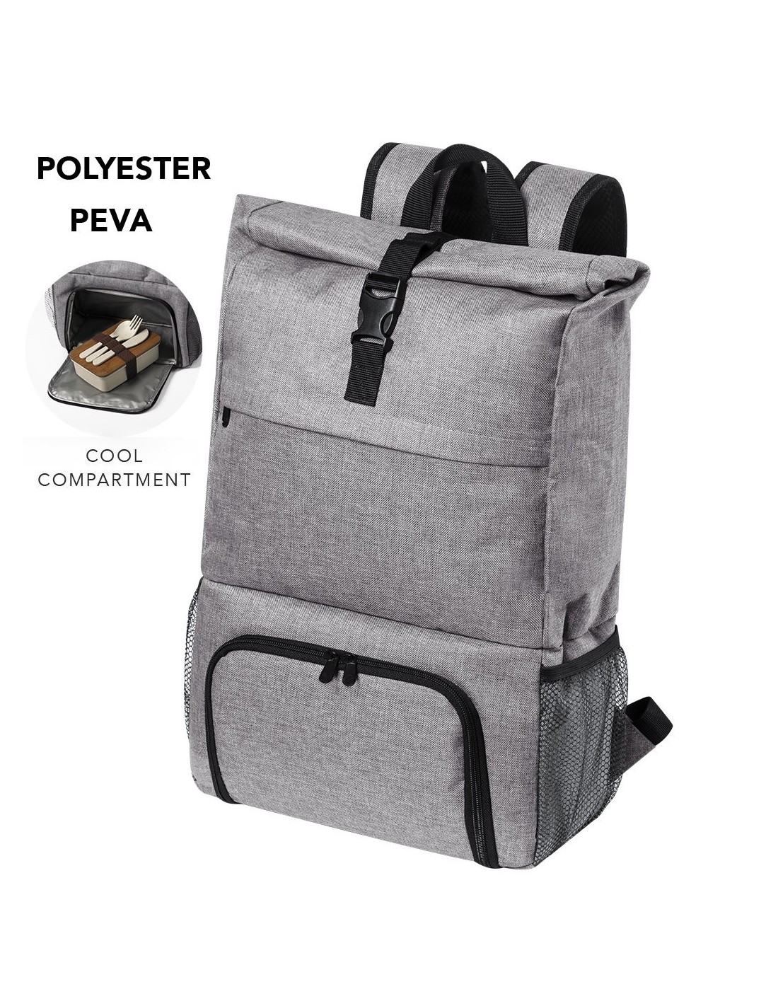 Mochila multiusos en resistente poliéster 600D de acabado denim. De diseño urbano, incluye compartimento estanco isotérmico independiente con cobertura de PEVA para fiambrera. Compartimento principal con cierre de seguridad de hebilla y bolsillos laterales de redecilla. Con cintas de hombros acolchadas, de ajuste regulable.
