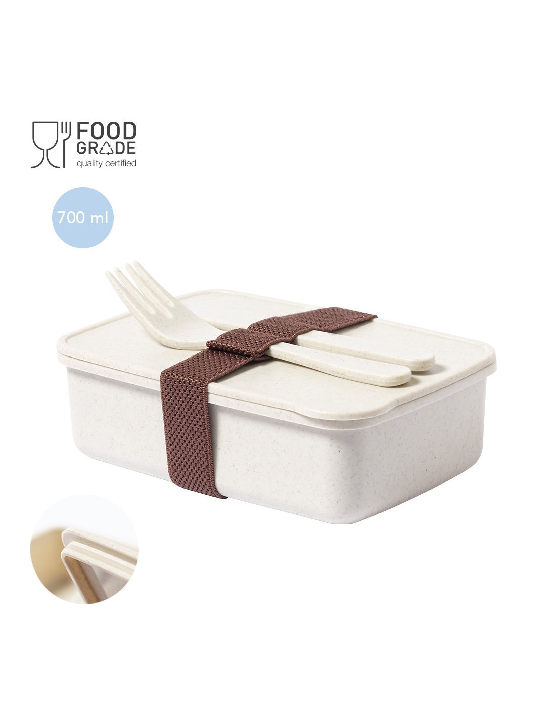 Fiambrera fabricada en PP veteado libre de BPA. De 700ml de capacidad, incluye cinta elástica de seguridad con tenedor y cuchillo. Certificación Food Grade, garantizando la seguridad cuando los alimentos entran en contacto con el material usado para fabricar el producto.
