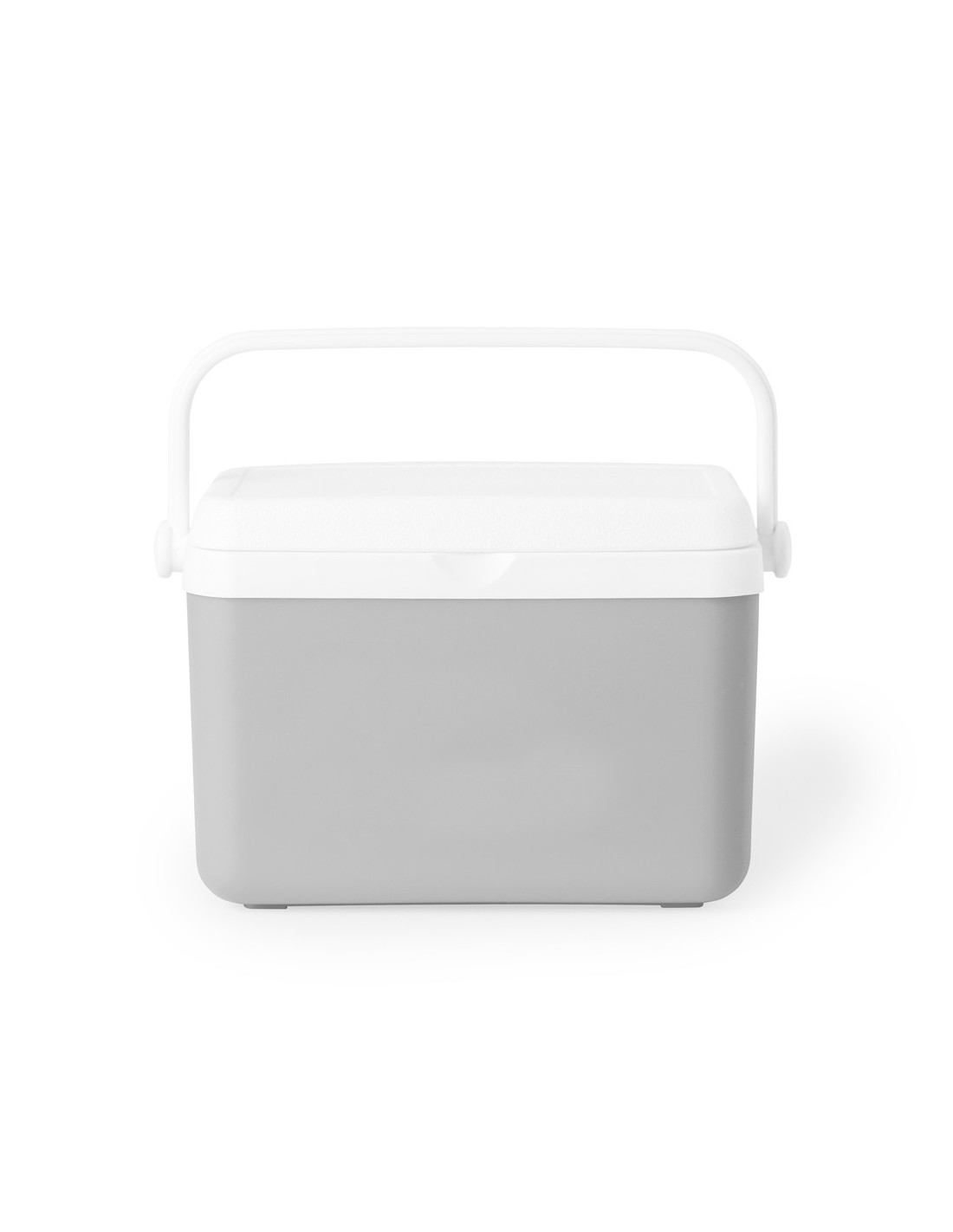 Nevera fabricada en PP de 4L. Atractivo diseño vintage para mantener bebidas y alimentos fríos, de diseño rígido con doble pared. Tapadera de bisagra con cierre de seguridad y asa rígida para un fácil transporte. Con base de color gris y accesorios en blanco. Presentada individualmente en bolsa reciclada.