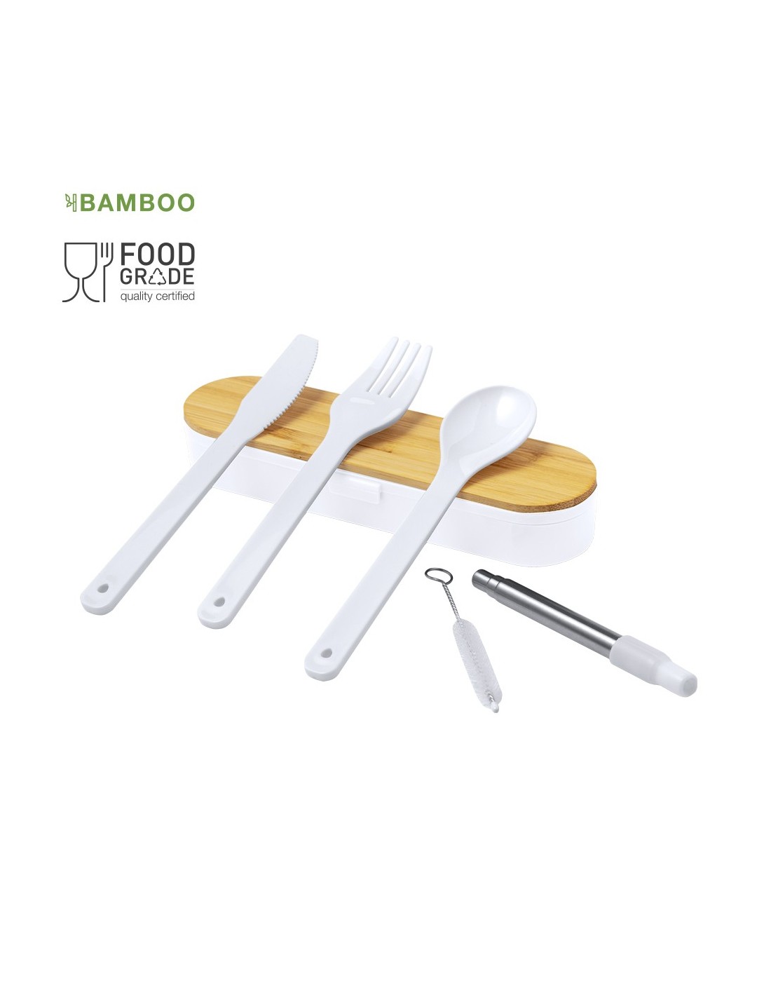 Set de cubiertos elaborados en PP y libre de BPA, acompañados por un estuche de presentación a juego y tapadera de bambú. Este completo set incluye cuchara, tenedor, cuchillo y pajita plegable con su respectivo limpiador. Cuenta con la Certificación Food Grade, garantizando la seguridad cuando los alimentos entran en contacto con el material usado para fabricar el producto. Presentados en bolsa individual reciclada..Materiales como el bambú fomentan la utilización de materias primas naturales, reduciendo las emisiones contaminantes. Proviene de una planta de gran resistencia y versatilidad, con crecimiento y regeneración rápidos, siendo una excelente alternativa al uso de madera tradicional.