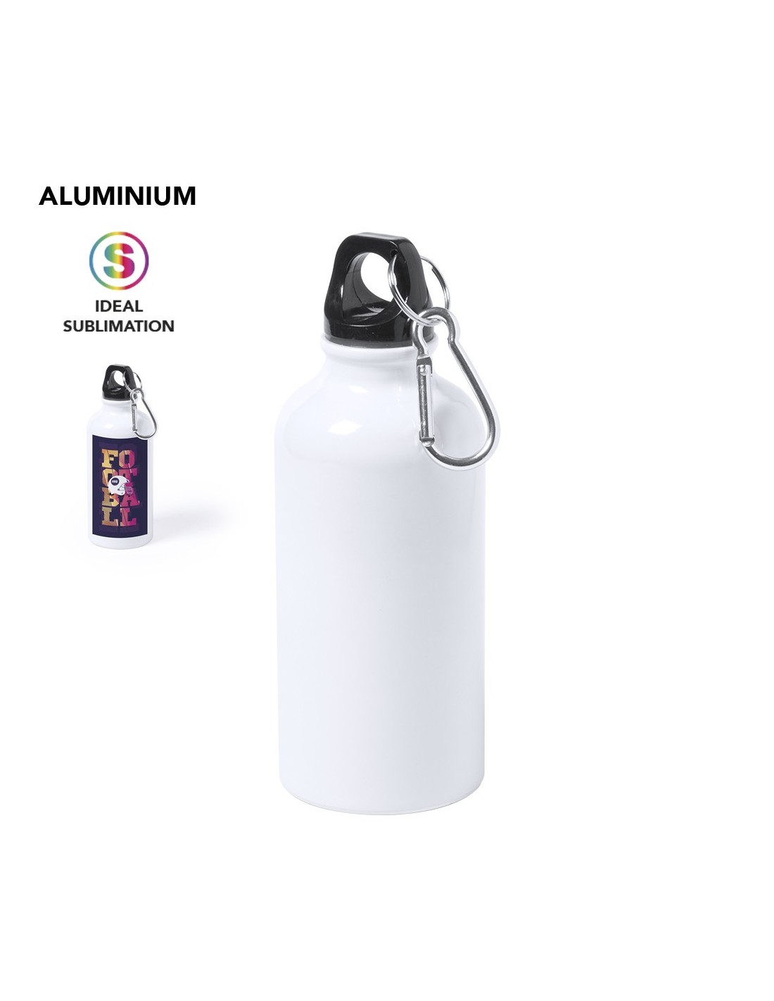 Bidón de 400ml de capacidad con cuerpo de acabado en suave y brillante color blanco, especialmente diseñado para marcaje en sublimación. Con tapón de seguridad a rosca y mosquetón metálico de transporte. Presentado en caja individual.