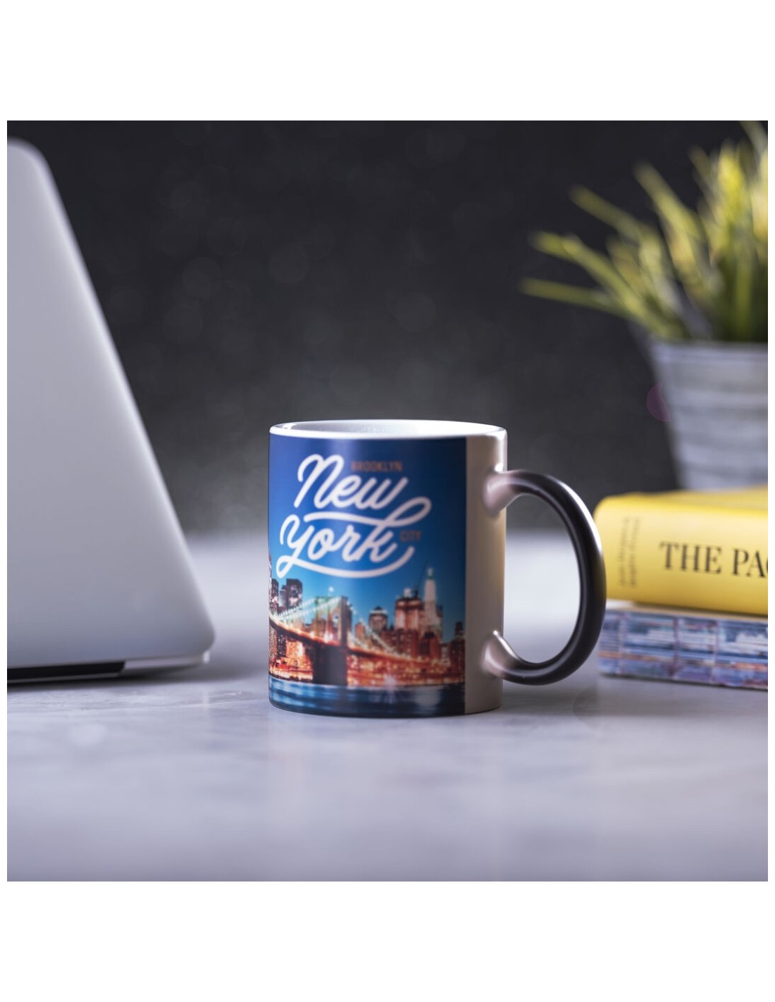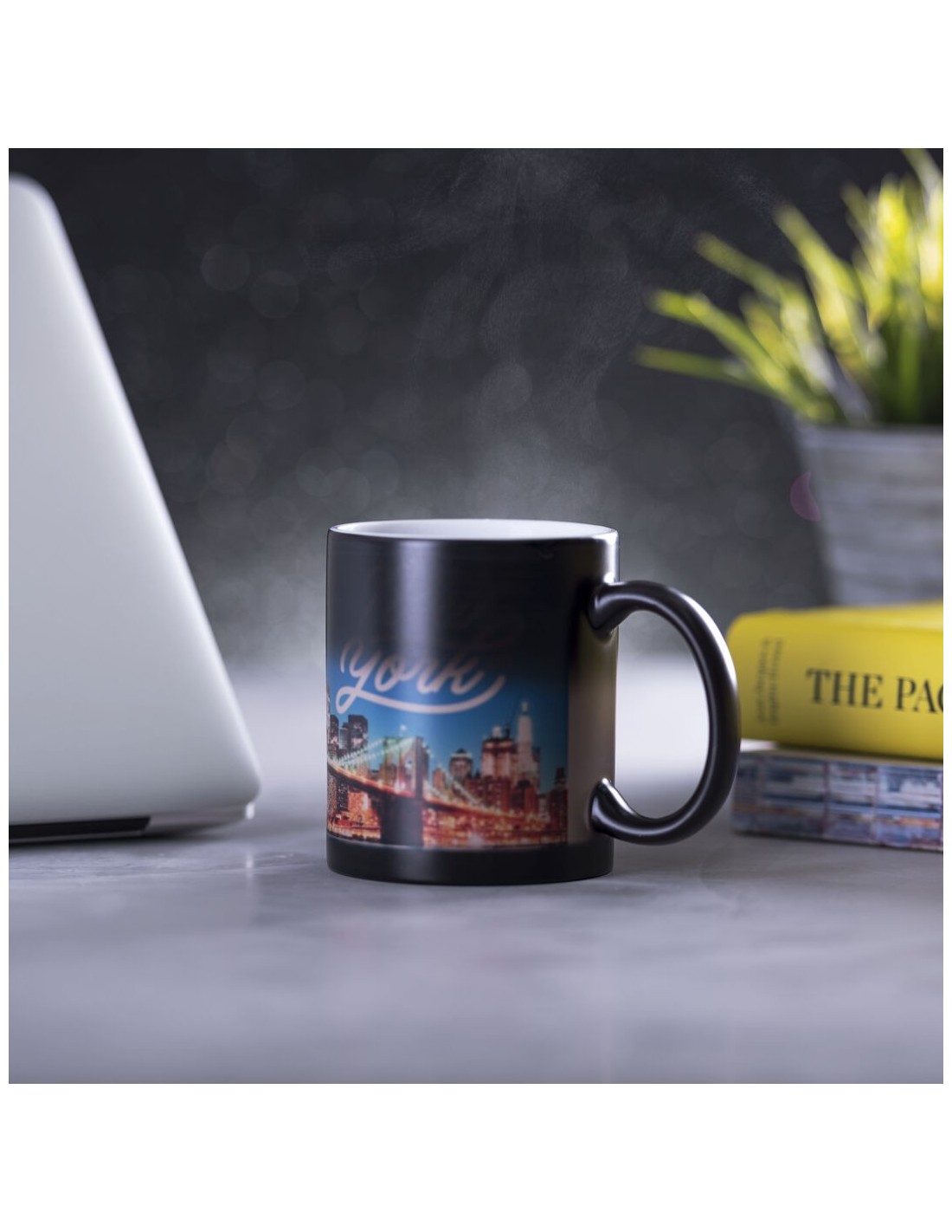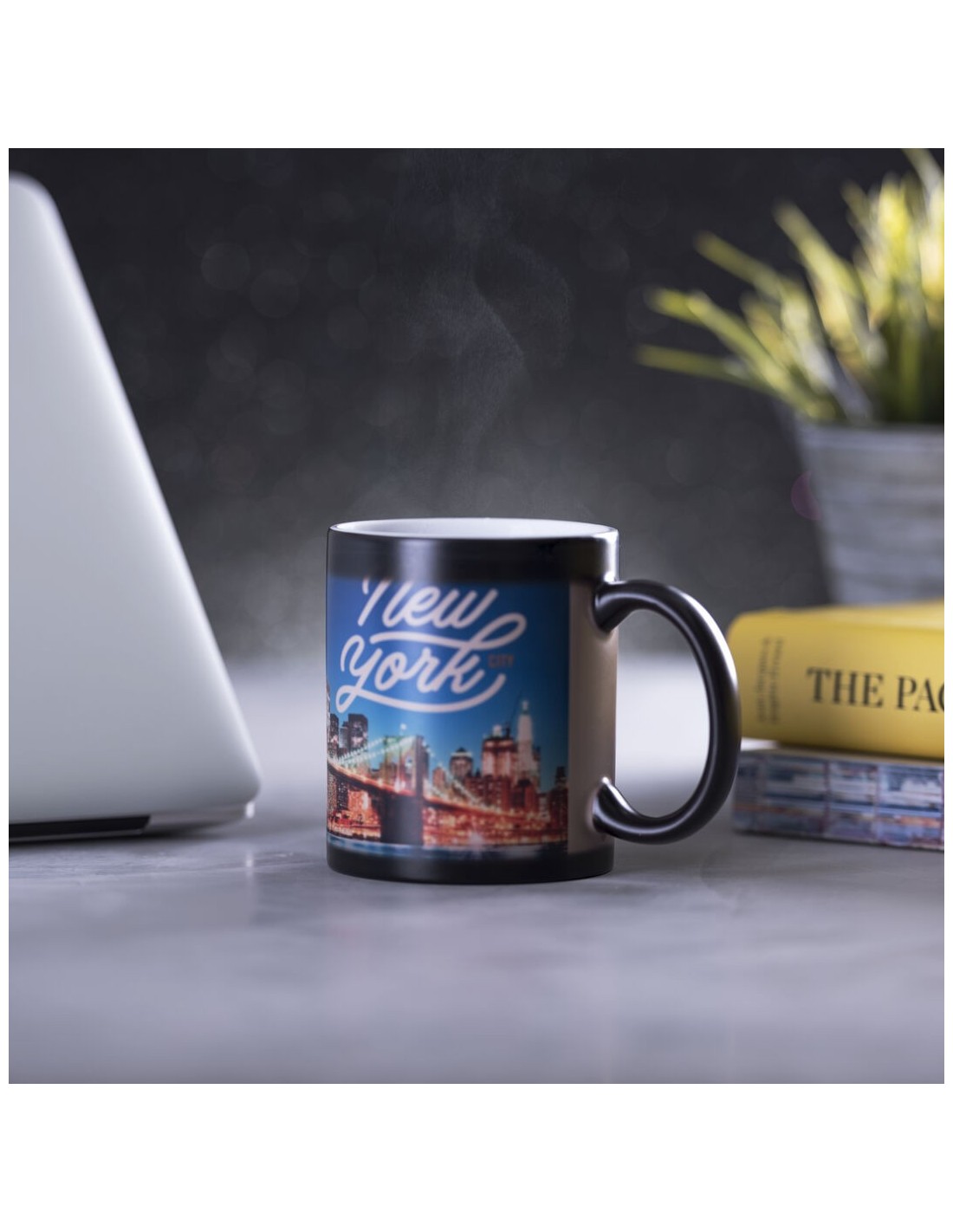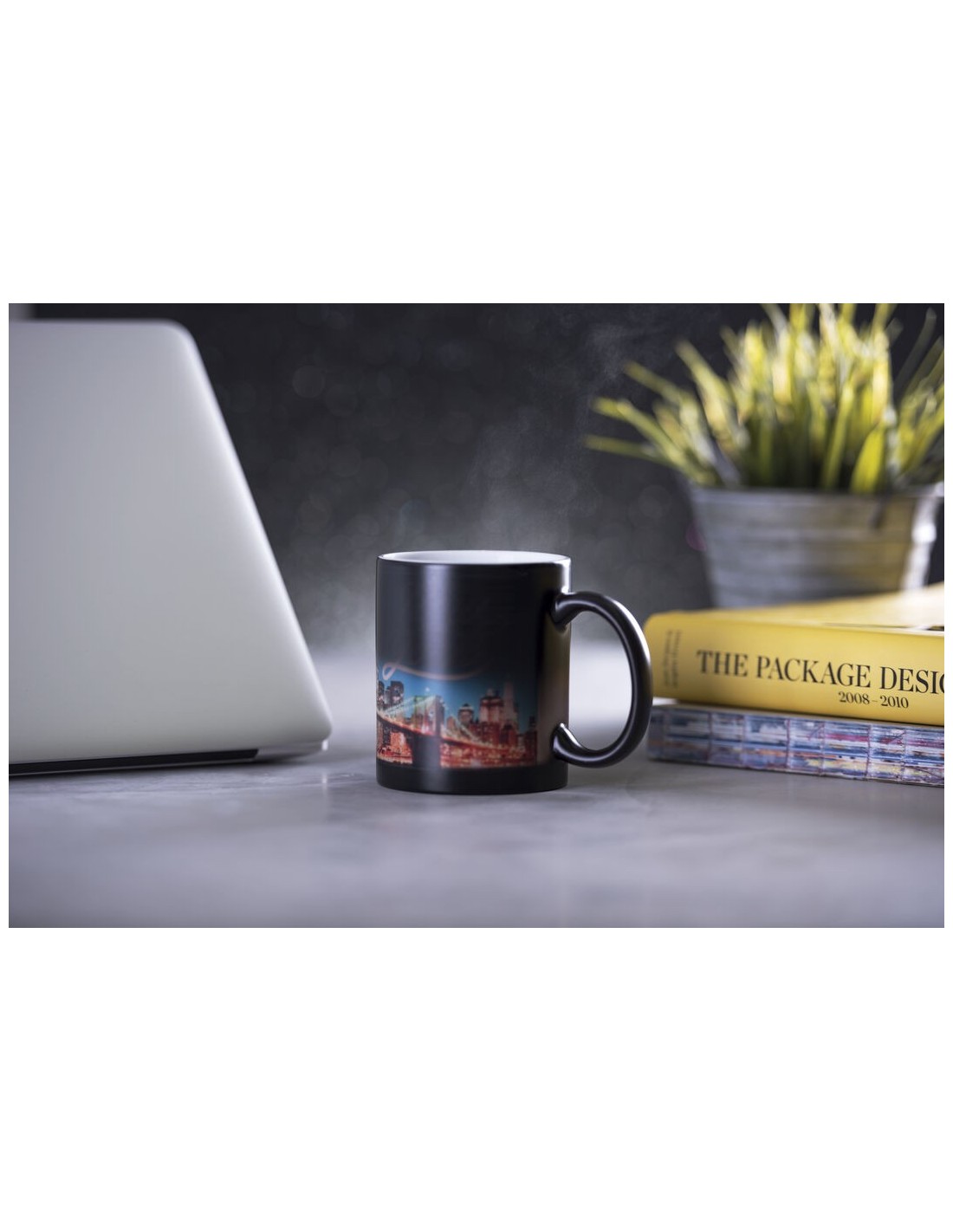 Taza de cerámica de 350ml de capacidad con exterior en color negro e interior en blanco. Especialmente diseñada para marcaje en sublimación. Presentada en caja individual.