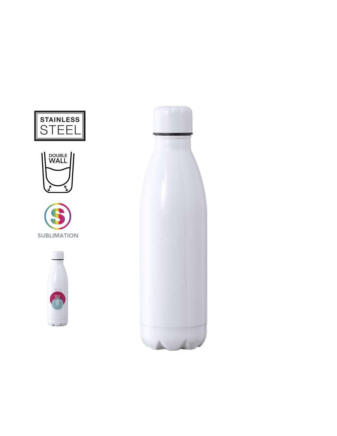 Bidón térmico de 500 ml de capacidad, fabricado en acero inox de doble pared y especialmente diseñado para marcaje en sublimación. De acabado blanco brillo y con tapón a rosca a juego, libre de BPA. Presentado en caja individual de diseño kraft.