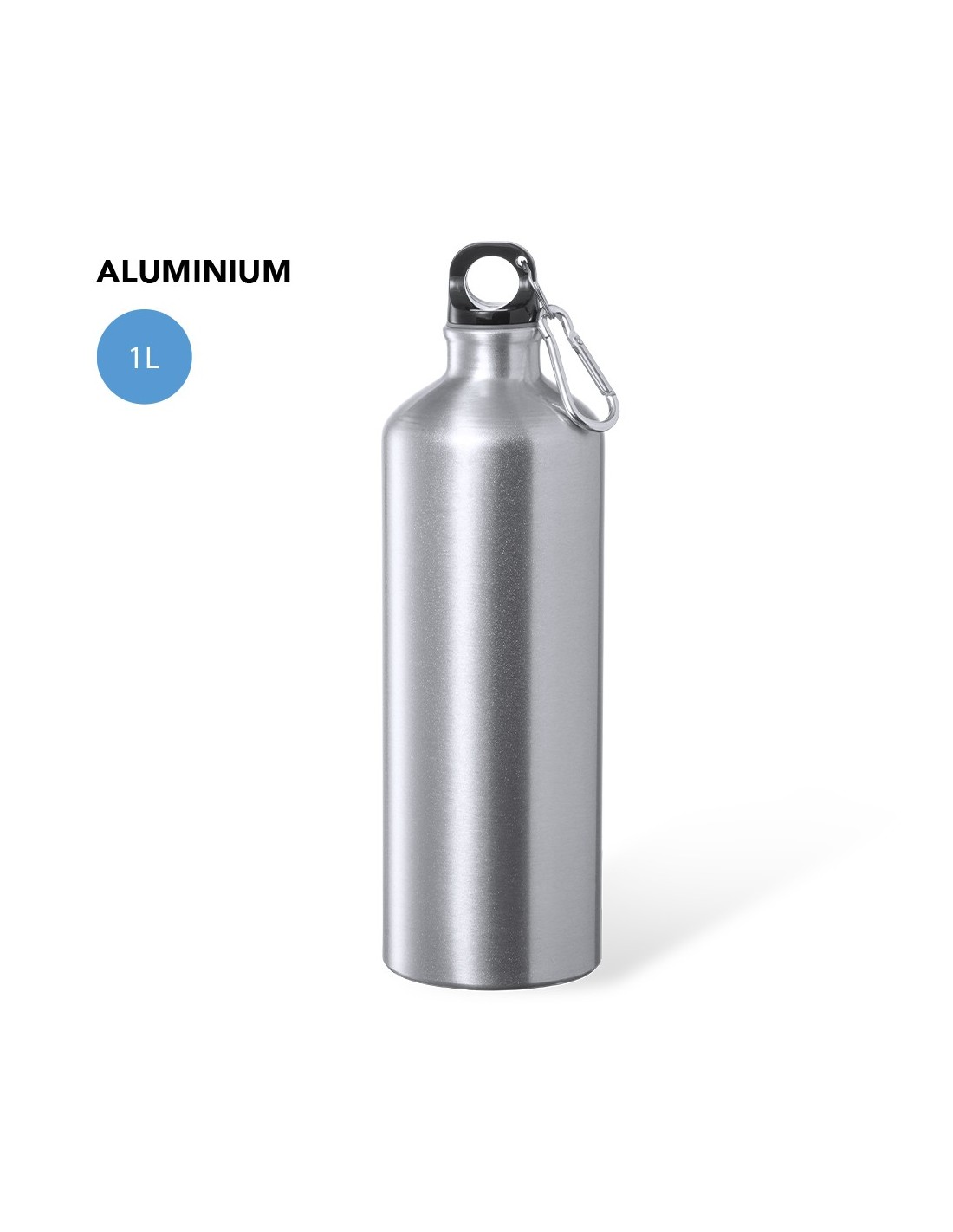 Bidón de 1 l de capacidad, fabricado en aluminio de acabado brillo. Tapón a rosca en negro, con anilla y mosquetón de transporte. Libre de BPA y presentado en caja individual de diseño kraft.