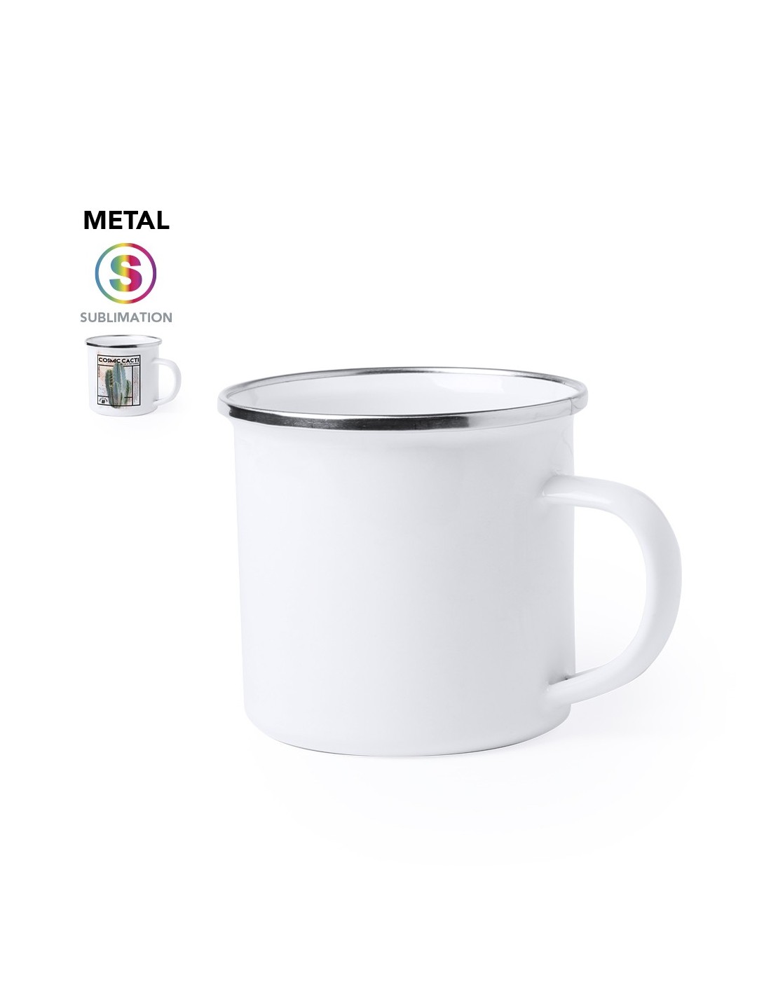 Taza metálica de diseño retro y 380ml de capacidad, con pequeñas imperfecciones para un aspecto vintage . Especialmente diseñada para marcaje en sublimación, con elegante anilla cromada y presentada en caja individual.