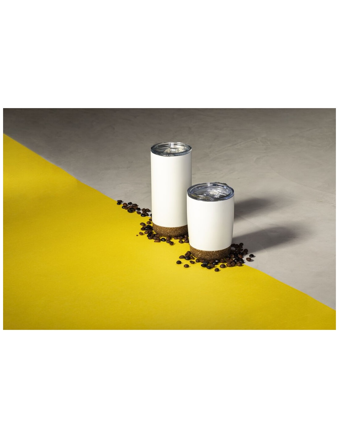 Vaso en 500 ml de capacidad, de línea nature en combinación de base en corcho natural con cuerpo en acero inox de acabado blanco. Con doble cobertura para mejor y mas duradera conservación de la temperatura y original tapón dosificador transparente. Presentado en atractiva caja de diseño.