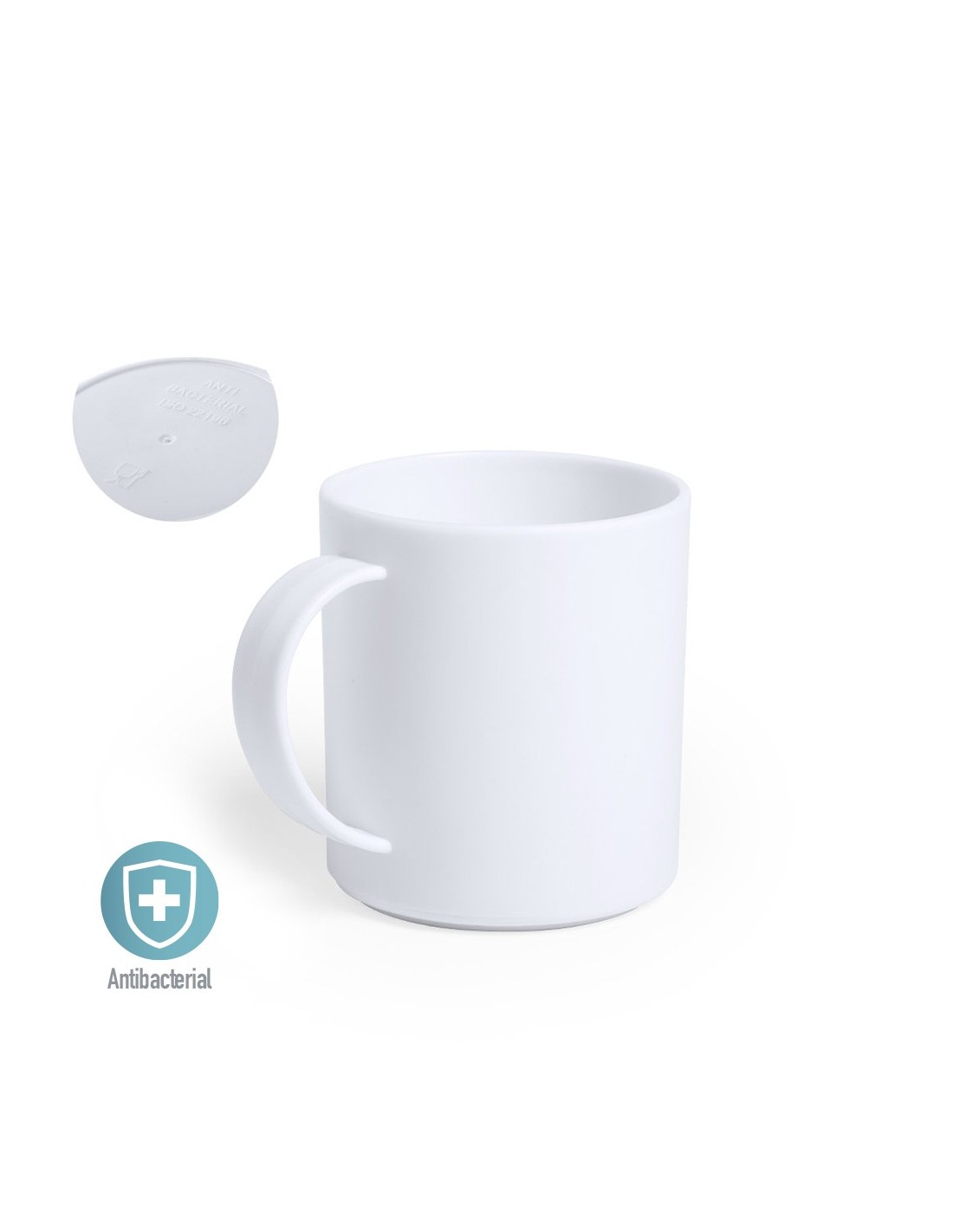 Taza antibacteriana en resistente material PP de acabado sólido y libre de BPA. 350 ml de capacidad, presentada en bolsa individual. Los productos con tratamientos antibacterianos son capaces de reducir drásticamente las cargas bacterianas presentes en las superficies de los materiales, gracias a la incorporación de agentes microbianos permanentes estáticos, con alta efectividad para inhibir y prevenir la contaminación bacteriana. Artículo de acuerdo al estándar ISO 22196, que determina la actividad antibacteriana en materiales plásticos y superficies no porosas, lo que permite conocer la efectividad de inhibición microbiana que tienen los aditivos sobre los objetos tratados mediante una evaluación cuantitativa.