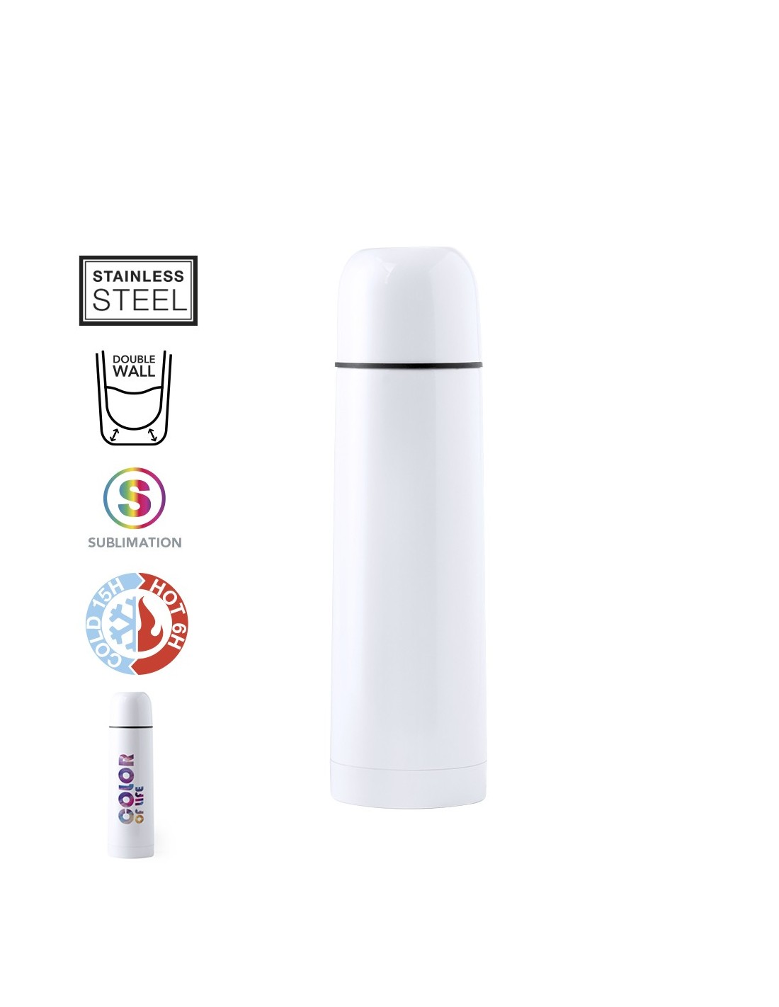 Termo de 500ml de capacidad en resistente acero inox. Superficie exterior especialmente diseñada para marcaje en sublimación. Con tapón de seguridad y presentado en atractiva caja individual de diseño.