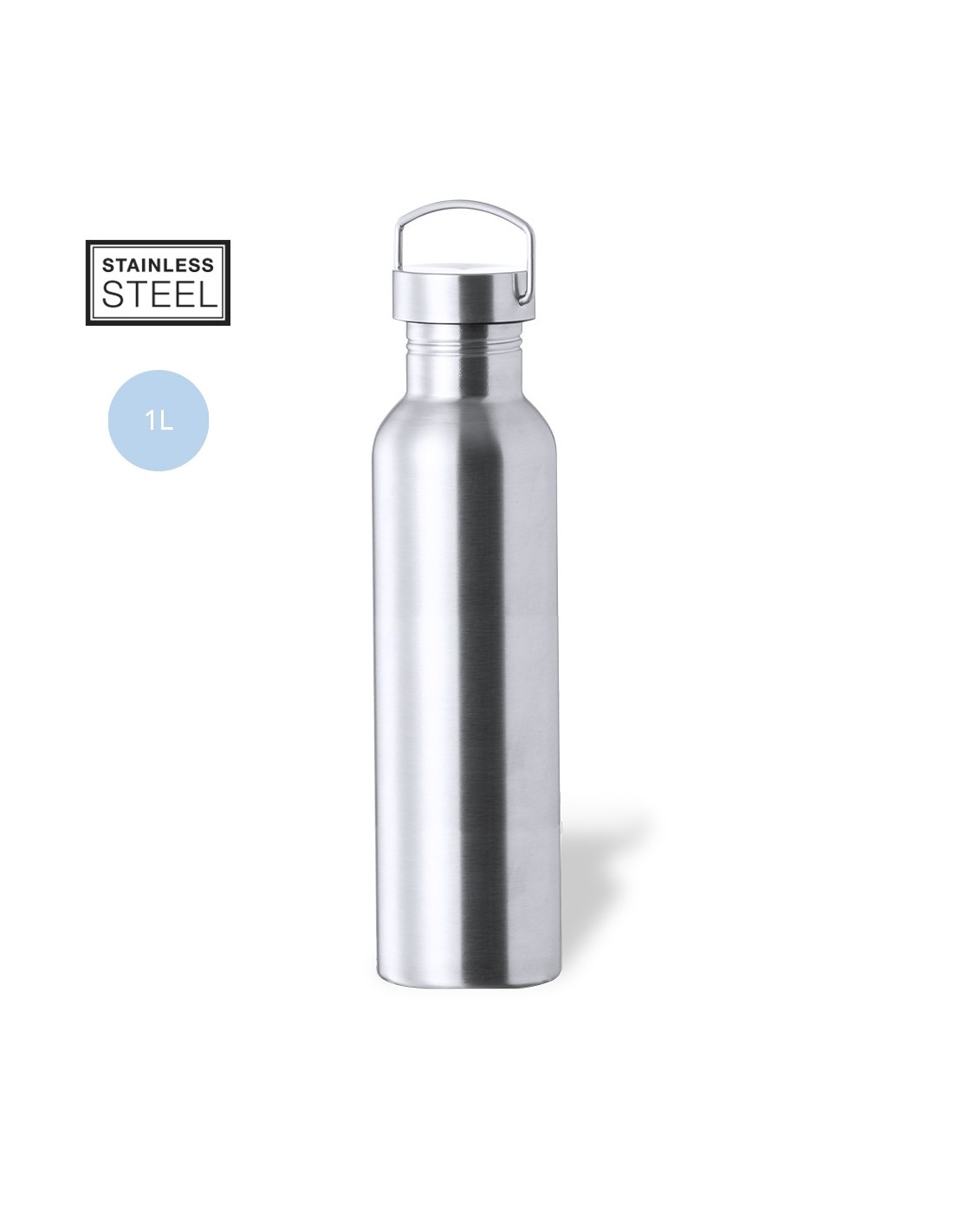 Bidón de 1 l de capacidad, fabricado en acero inox de acabado brillo. Con original tapón a rosca en acero inox, a juego y con asa integrada. Libre de BPA y presentado en caja individual de diseño kraft.