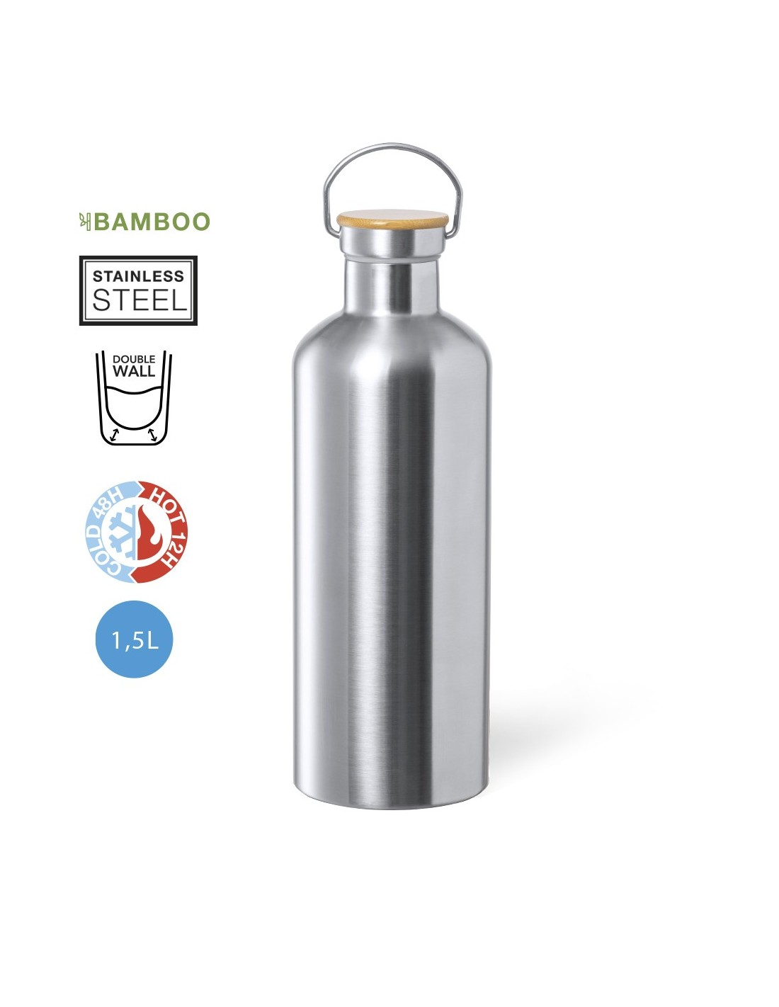 Bidón térmico jumbo de 1,5 l de capacidad, fabricado en acero inox de doble pared y acabado mate. Incluye original tapón a rosca en acero inox, con detalle de bambú y asa integrada. Libre de BPA y presentado en caja individual de diseño kraft.