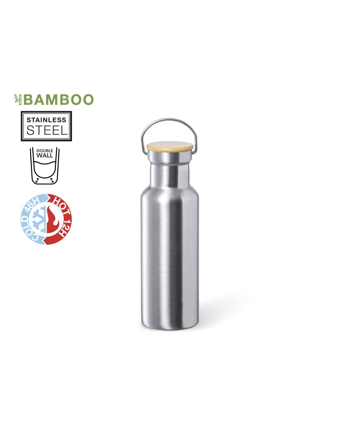 Bidón térmico de 500 ml de capacidad, fabricado en acero inox de doble pared y acabado mate. Incluye original tapón a rosca en acero inox, con detalle de bambú y asa integrada. Libre de BPA y presentado en caja individual de diseño kraft.