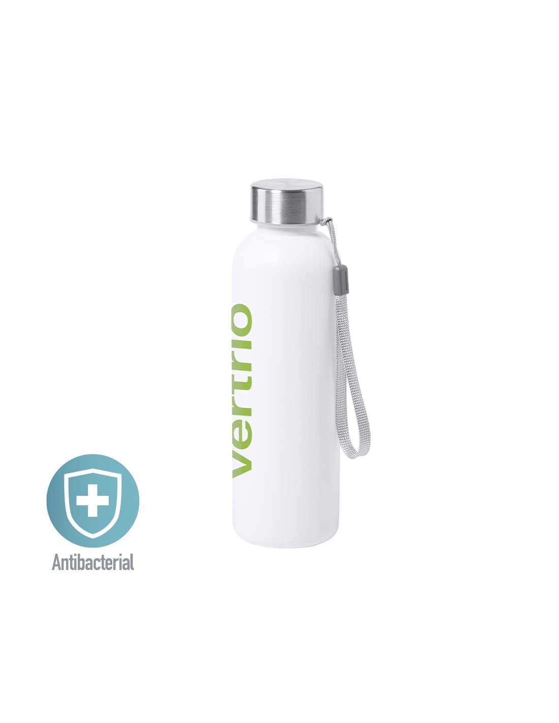 Bidón antibacteriano resistente material PE de acabado blanco. 600 ml de capacidad, con tapón en acero inox a rosca -libre de BPA- y cómoda cinta de transporte. Los productos con tratamientos antibacterianos son capaces de reducir drásticamente las cargas bacterianas presentes en las superficies de los materiales, gracias a la incorporación de agentes microbianos permanentes estáticos, con alta efectividad para inhibir y prevenir la contaminación bacteriana. Artículo de acuerdo al estándar ISO 22196, que determina la actividad antibacteriana en materiales plásticos y superficies no porosas, lo que permite conocer la efectividad de inhibición microbiana que tienen los aditivos sobre los objetos tratados mediante una evaluación cuantitativa.