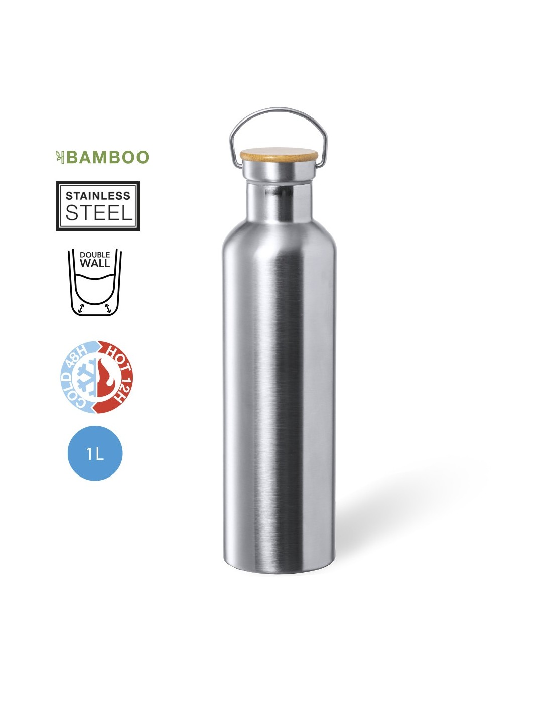 Bidón térmico de 1 l de capacidad, fabricado en acero inox de doble pared y acabado mate. Incluye original tapón a rosca en acero inox, con detalle de bambú y asa integrada. Libre de BPA y presentado en caja individual de diseño kraft.