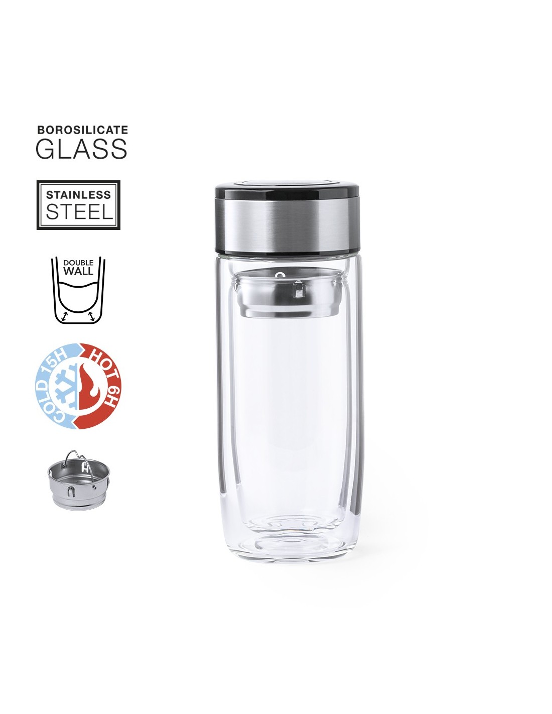 Vaso térmico en alta calidad de doble pared y 330ml de capacidad. Fabricado en cristal de borosilicato, que ofrece una resistencia y durabilidad excepcionales, alargando su vida útil y pudiendo ser reutilizado infinidad de veces. Tapón en acero inox con infusor integrado y libre de BPA. Presentado en atractiva caja de diseño.