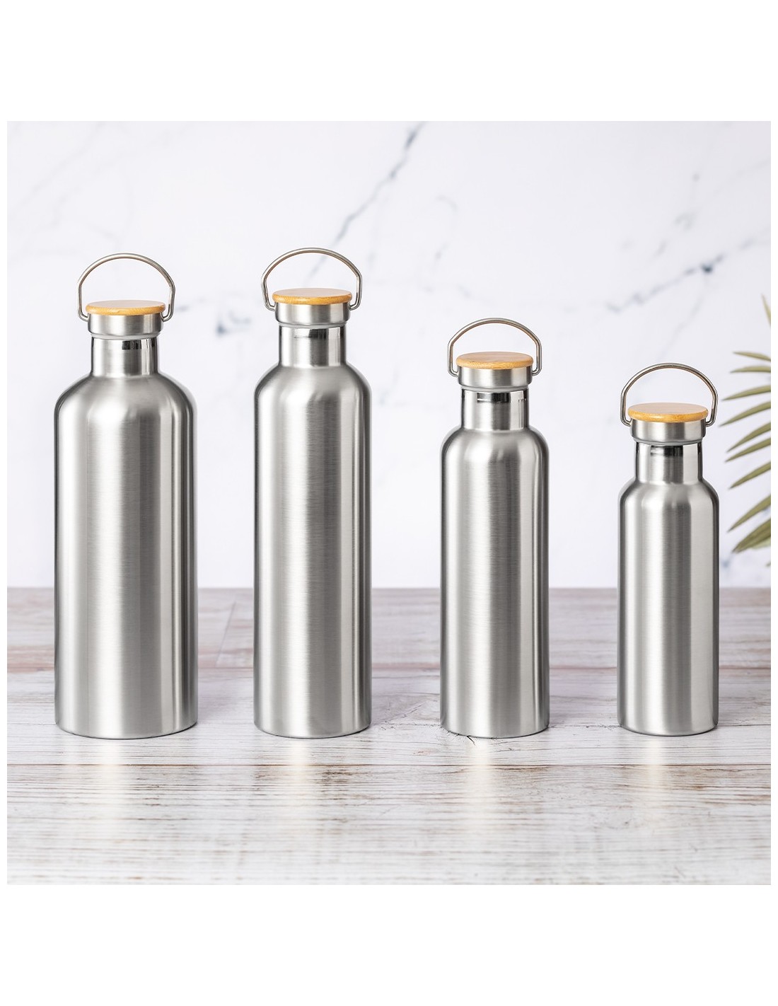 Bidón térmico de 750 ml de capacidad, fabricado en acero inox de doble pared y acabado mate. Incluye original tapón a rosca en acero inox, con detalle de bambú y asa integrada. Libre de BPA y presentado en caja individual de diseño kraft.