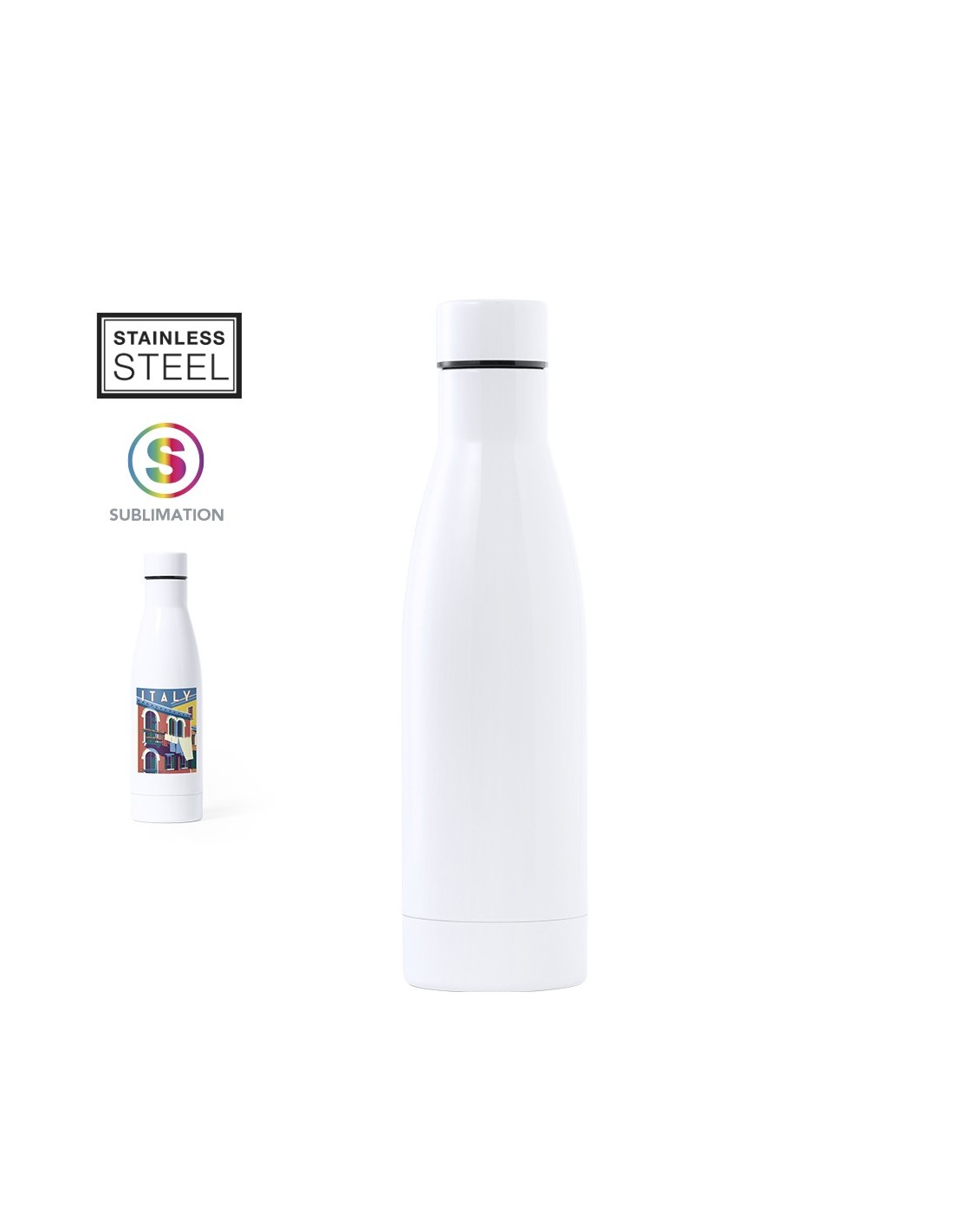 Bidón de acero inox de 750ml de capacidad. Acabado en suave y brillante color blanco, especialmente diseñado para marcaje en sublimación. Con tapón de seguridad en acero inox, libre de BPA. Presentado en atractiva caja de diseño.