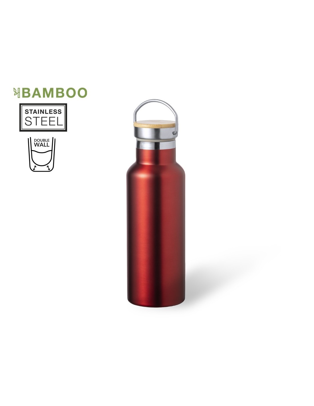 Bidón térmico de 500 ml de capacidad, fabricado en acero inox de doble pared. Incluye original tapón a rosca en acero inox, con detalle de bambú y asa integrada. Disponible en variada gama de colores y presentado en caja individual de diseño kraft.