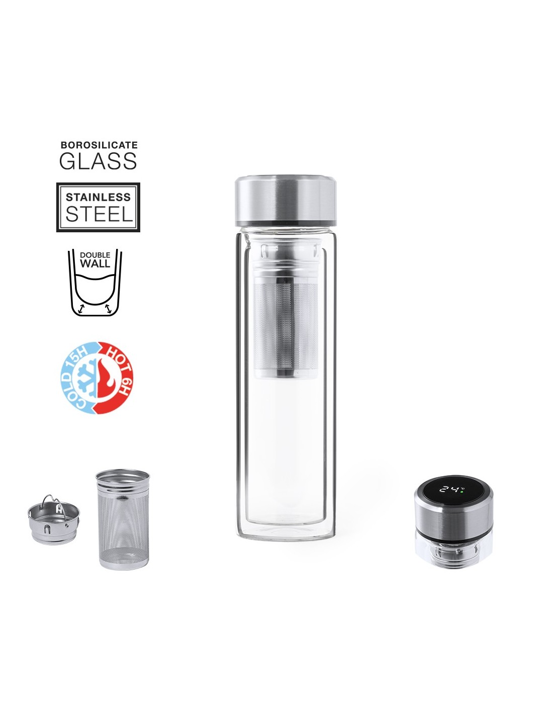 Termo en alta calidad de doble pared y 390ml de capacidad, con medidor de temperatura táctil integrado en tapón. Fabricado en cristal de borosilicato, que ofrece una resistencia y durabilidad excepcionales, alargando su vida útil y pudiendo ser reutilizado infinidad de veces. Tapón en acero inox con infusor integrado y libre de BPA. Alimentación a pilas (de botón incluida) y disponible manual de instrucciones en español e inglés. Presentado en atractiva caja de diseño.