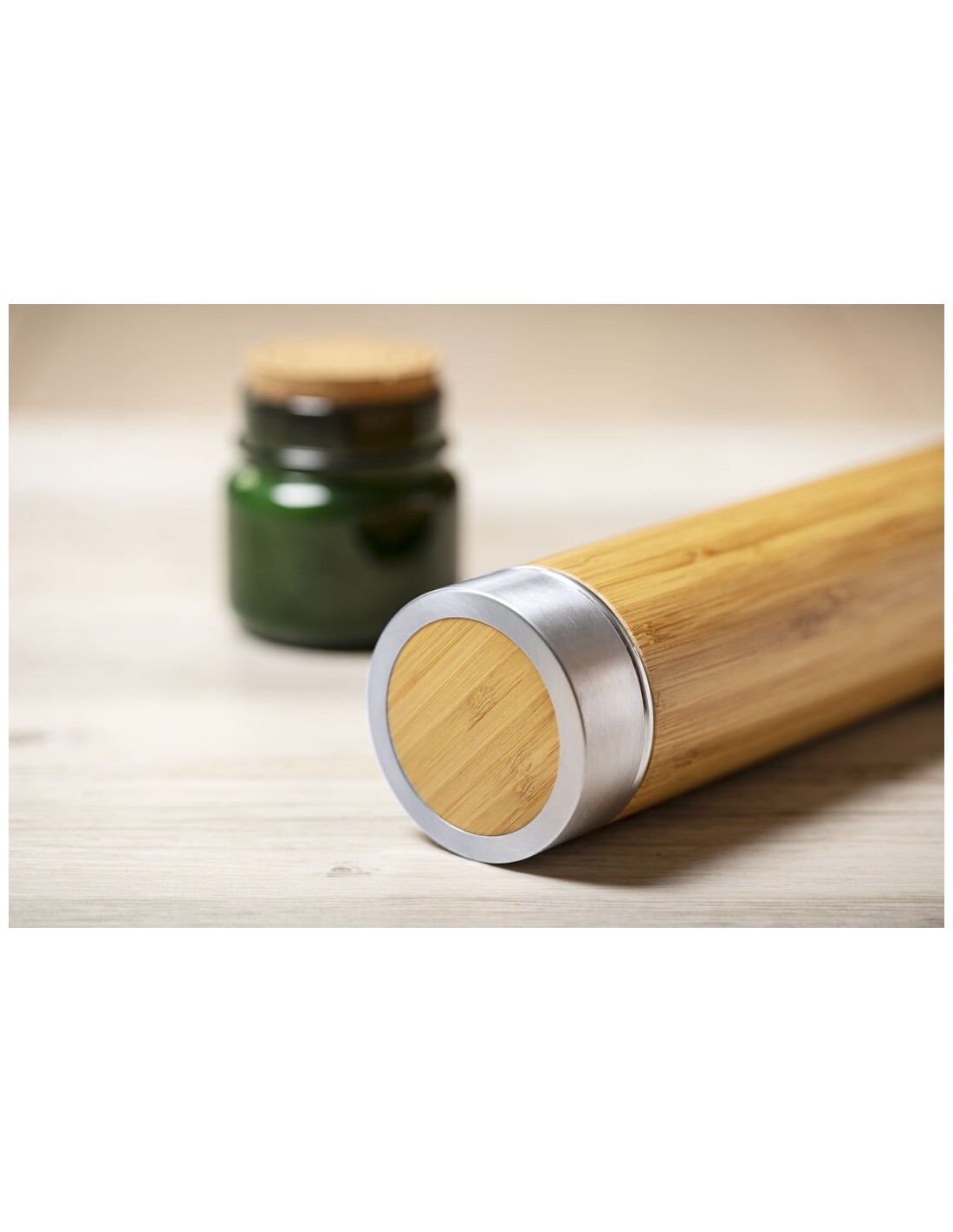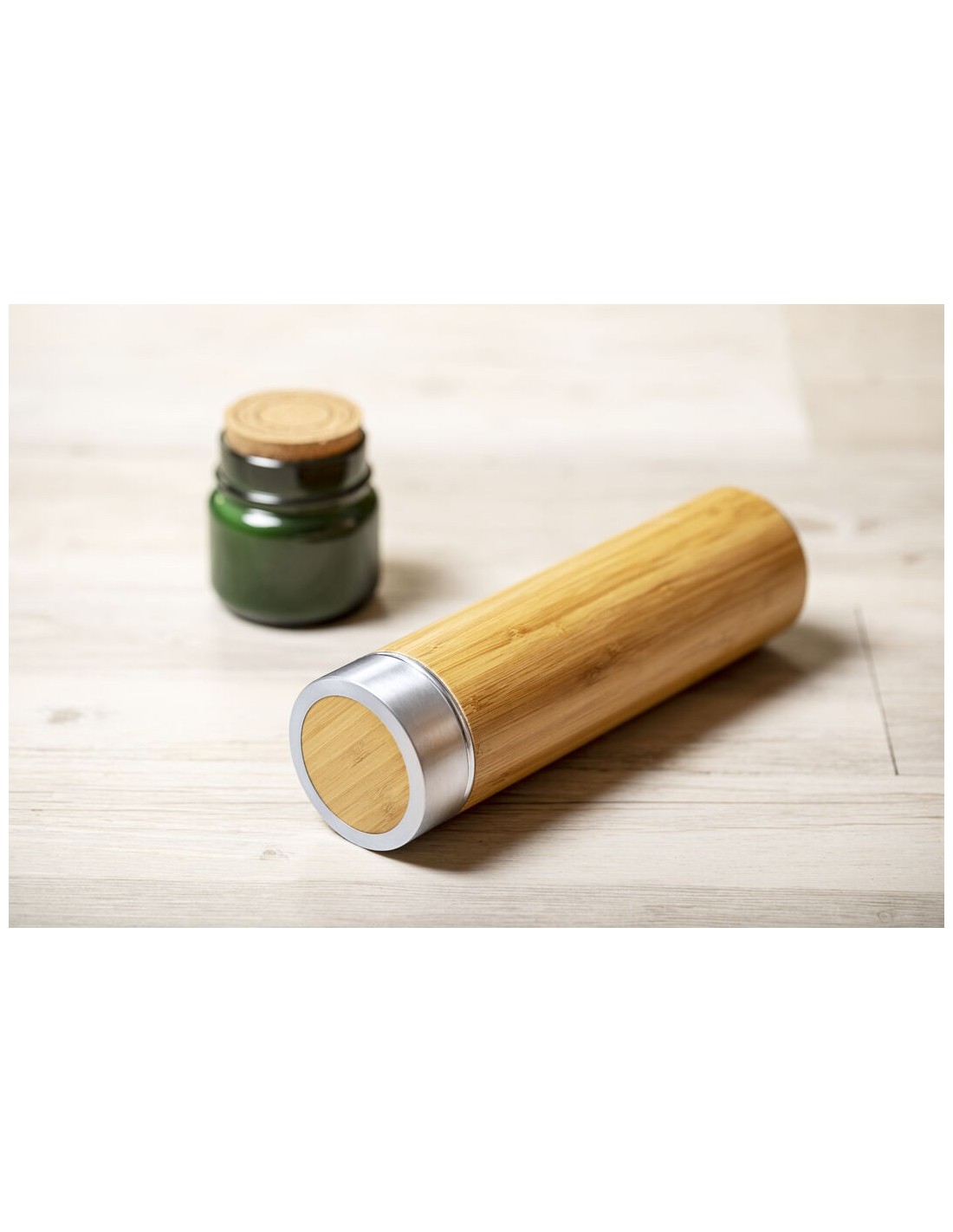 Termo en alta calidad y 500 ml de capacidad, con cuerpo acabado en bambú e interior en acero inox. Tapón de seguridad a rosca en acero inox y bambú. Presentado en una atractiva caja de diseño.