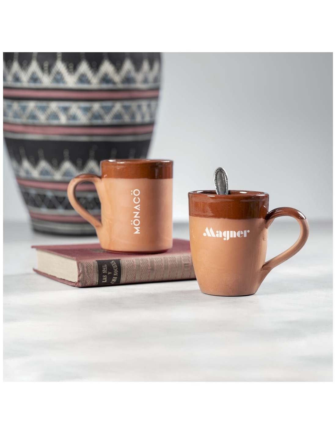 Taza de diseño clásico de 330 ml y diseño curvado. De fabricación europea y hecha en barro, que tanto por su origen natural como por sus procesos de transformación artesanales en la industria de la alfarería, se convierte en una de las opciones más sostenibles, además de ser altamente reciclable. Con contraste de acabados natural y esmaltado. Presentada en caja individual de acabado kraft, con distintivo Made in Europe.