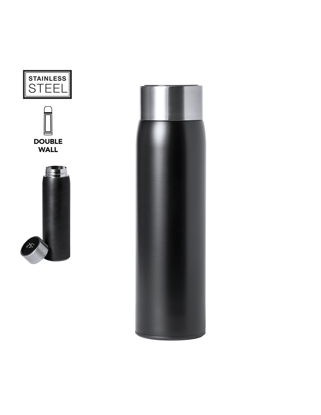Bidón térmico de acero inox y doble pared, con medidor de temperatura táctil integrado en tapón. 500ml de capacidad y de acabado mate. Con tapón de seguridad libre de BPA y presentado en atractiva caja de diseño. Alimentación a pilas (de botón incluida) y disponible manual de instrucciones en español e inglés.