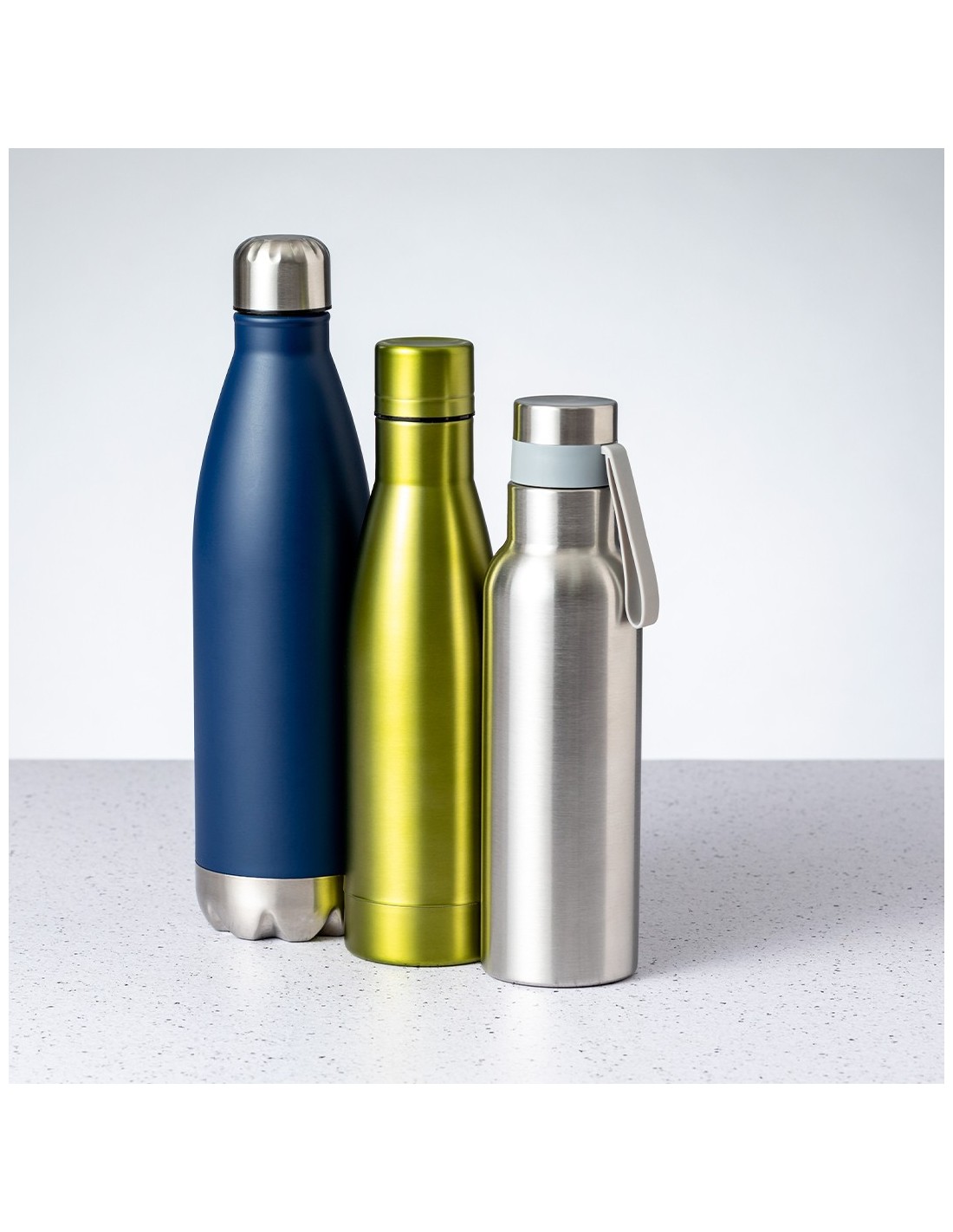 Bidón térmico de 750 ml de capacidad, fabricado en acero inox de doble pared. Con aislamiento de cobre al vacío, que permite mantener el calor y el frío durante más tiempo, llegando a las 12 y 48 horas respectivamente. Tapón a rosca, libre de BPA y con base a juego. Disponible en variada gama de colores metalizados y presentado en caja individual de diseño kraft.