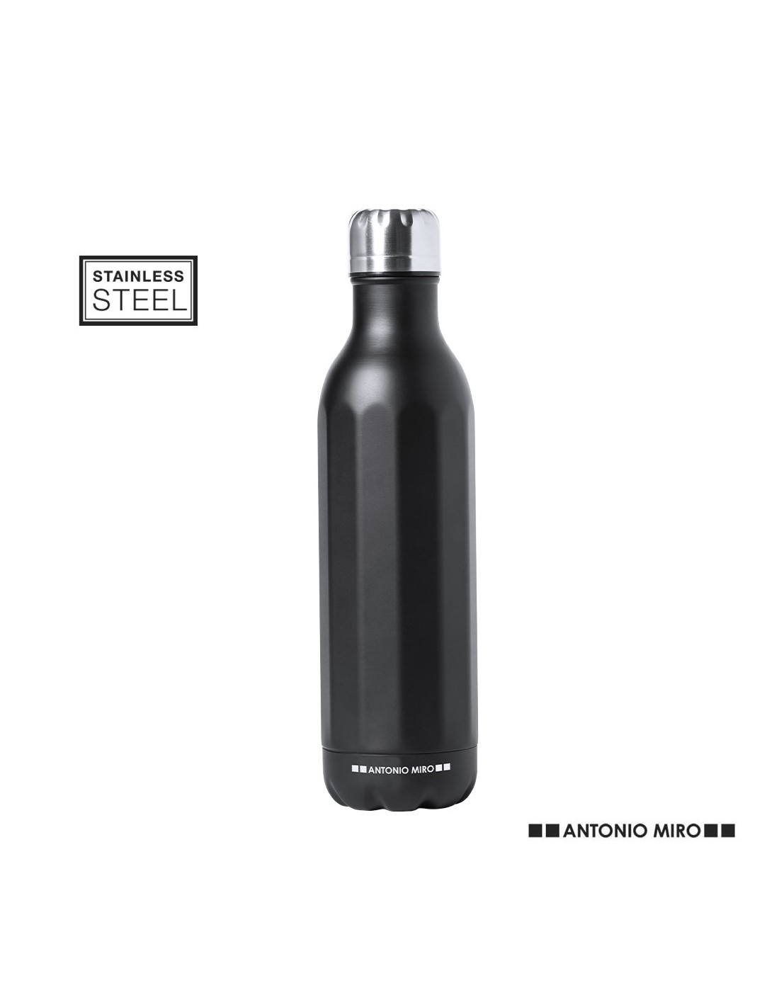Bidón en acero inox de Antonio Miró. De 750ml de capacidad y sobrio acabado en negro satinado, con cuerpo prisma y logotipo de la marca en la base. Con tapón cromado a rosca y presentado en atractiva caja de diseño con logotipo de la marca.