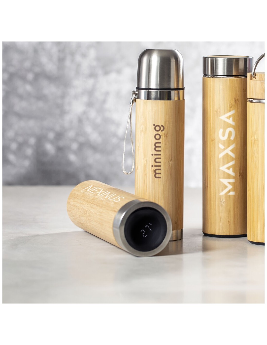 Termo en alta calidad acabado en bambú, de doble pared, con medidor de temperatura táctil integrado en tapón. 500 ml de capacidad, con tapón de seguridad libre de BPA e infusor integrado. Alimentación a pilas (de botón incluida) y disponible manual de instrucciones en español e inglés. Presentado en atractiva caja de diseño eco.