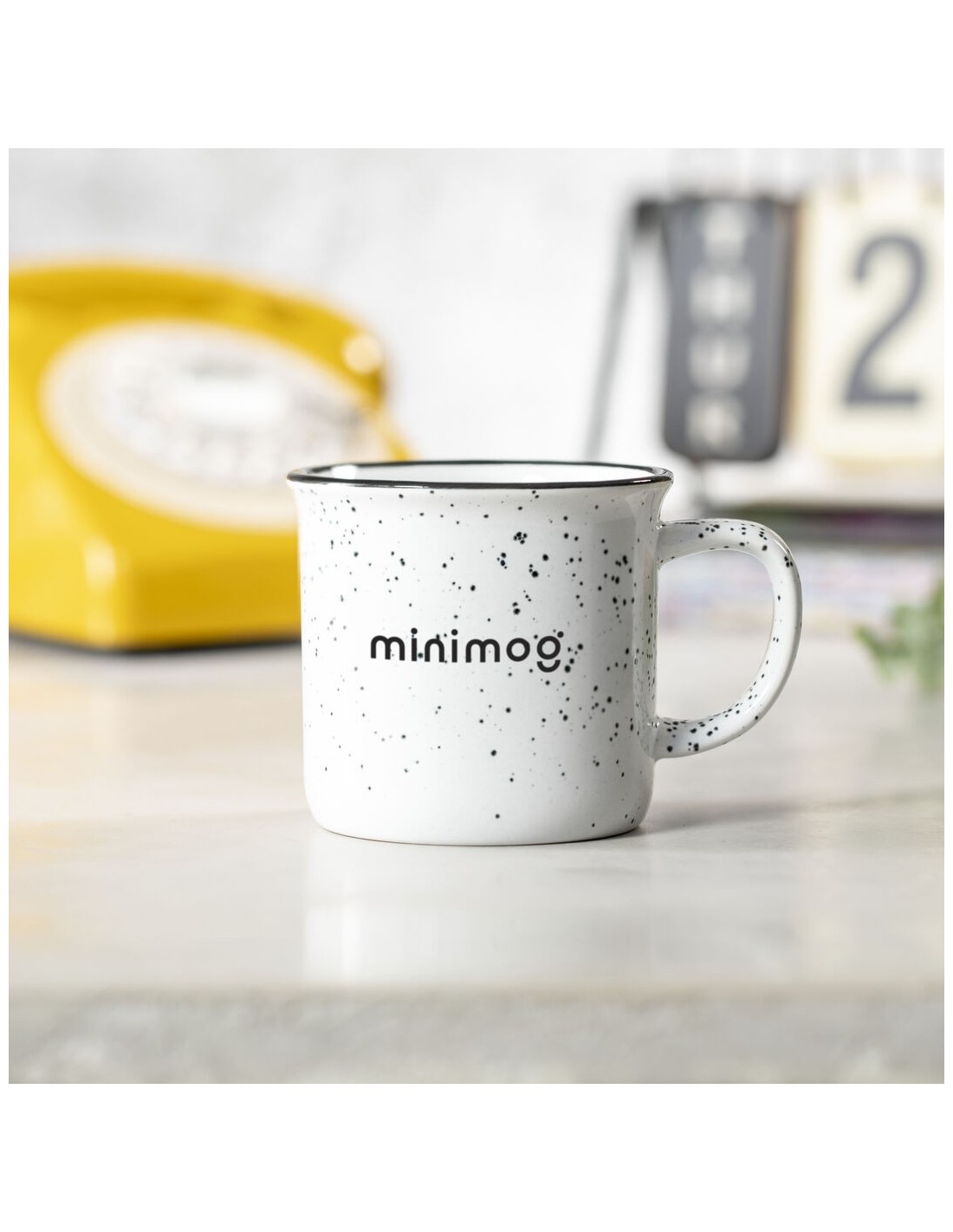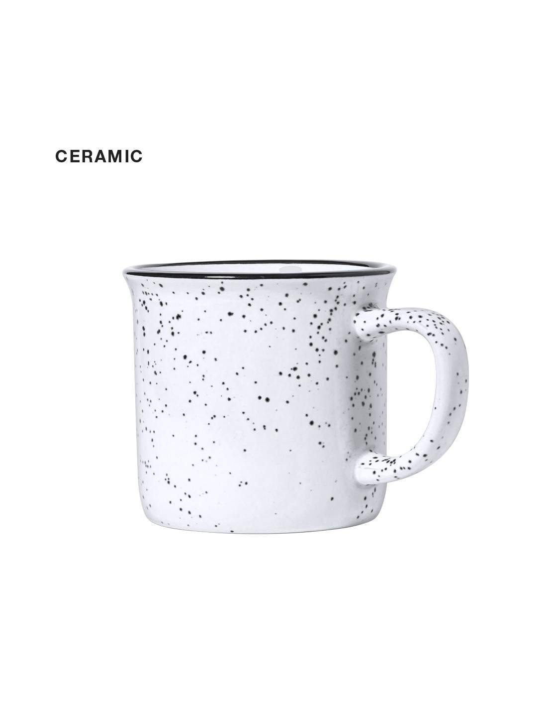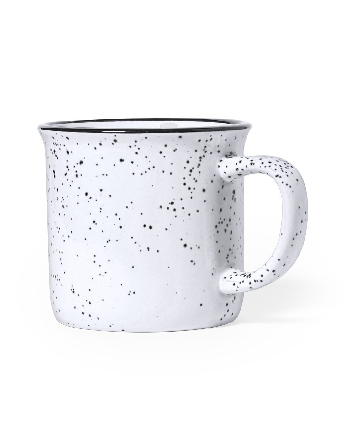 Taza de cerámica de 350ml de capacidad con diseño vintage. En combinación de exterior en colores moteados e interior a juego, con borde negro. Presentada en caja individual acabado kraft.