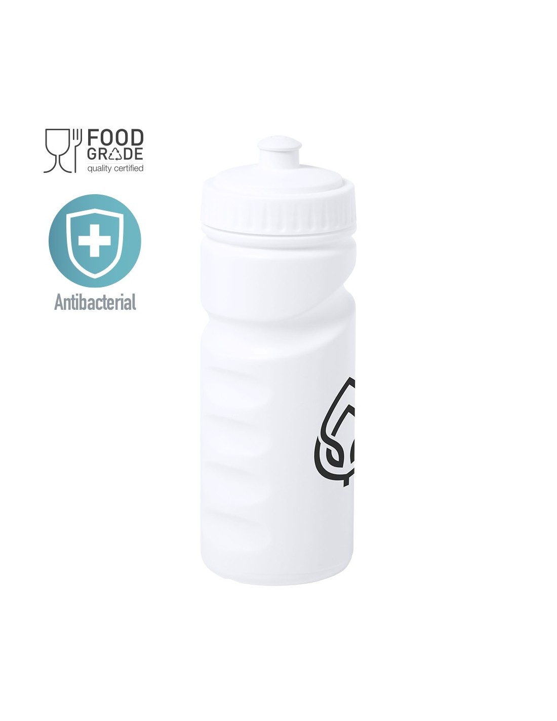 Bidón antibacteriano acabado en PE de color blanco, libre de BPA. 500ml de capacidad, con cuerpo ergonómico, tapón a rosca y dosificador de seguridad. Los productos con tratamientos antibacterianos son capaces de reducir drásticamente las cargas bacterianas presentes en las superficies de los materiales, gracias a la incorporación de agentes microbianos permanentes estáticos, con alta efectividad para inhibir y prevenir la contaminación bacteriana. Artículo de acuerdo al estándar ISO 22196, que determina la actividad antibacteriana en materiales plásticos y superficies no porosas, lo que permite conocer la efectividad de inhibición microbiana que tienen los aditivos sobre los objetos tratados mediante una evaluación cuantitativa.