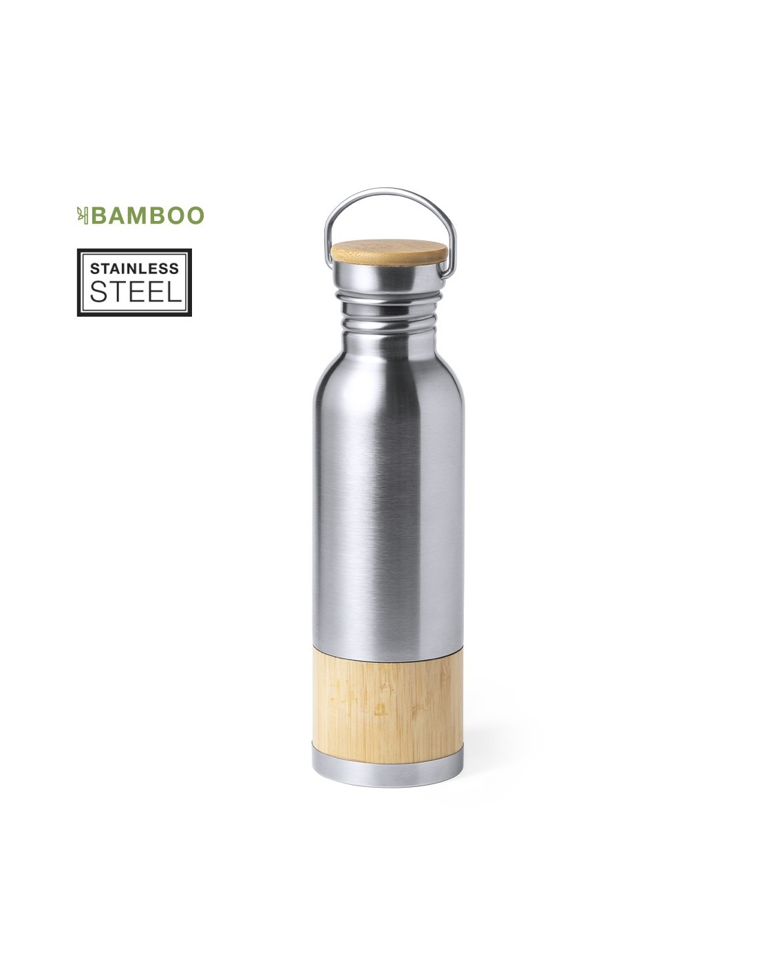 Bidón de original estilo retro y 800 ml de capacidad. Cuerpo en acero inox con franja de bambú, con tapón de seguridad a rosca en acero inox y detalle en bambú. Presentado en caja individual de diseño eco en cartón kraft.