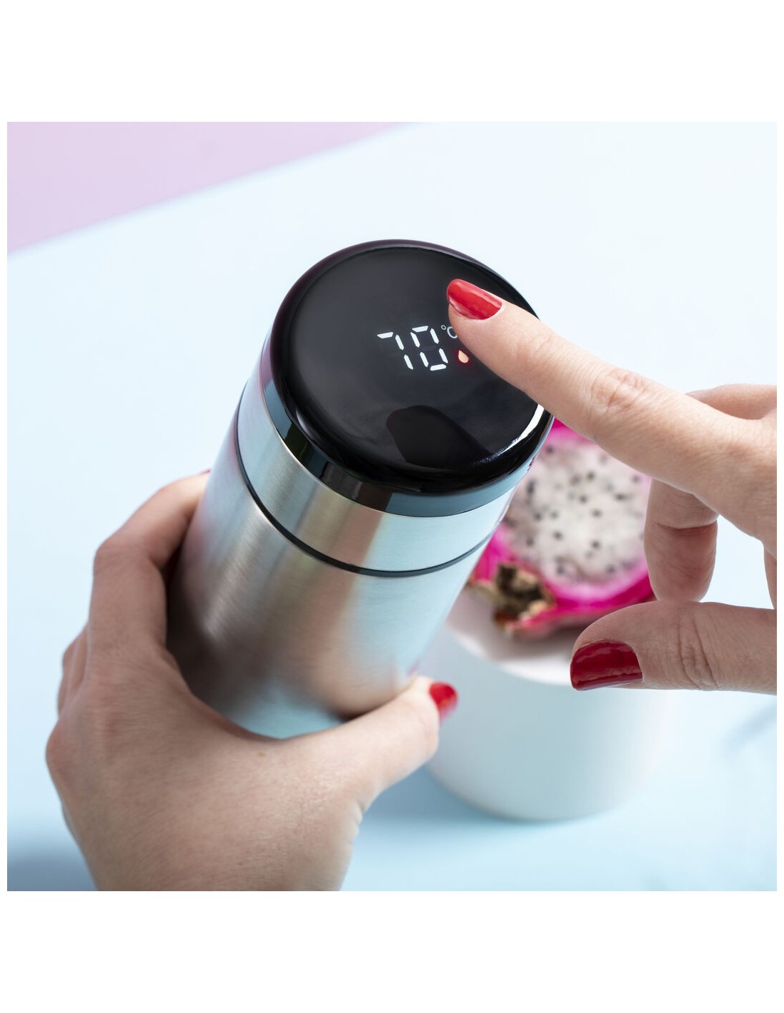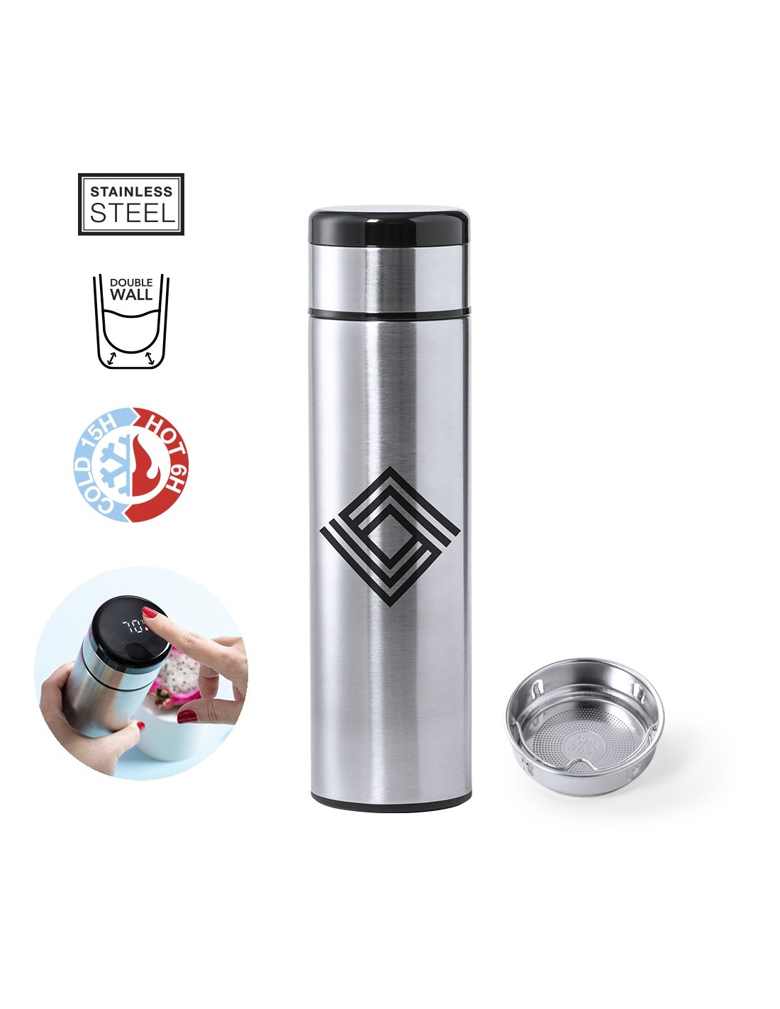 Termo en acero inox de 420ml de capacidad con medidor de temperatura táctil integrado en tapón (pila botón incluida). Con doble pared para mejor y más duradera conservación de la temperatura. Infusor incluido y sistema de apertura fácil a rosca. Disponible en color plateado y presentado en atractiva caja de diseño.