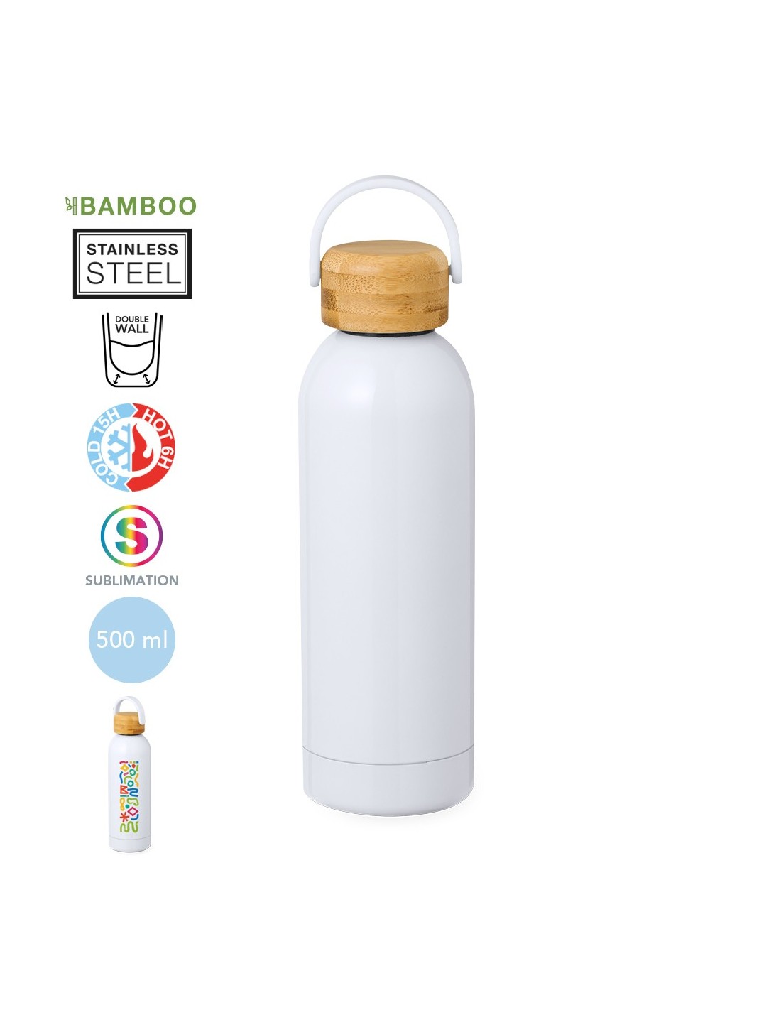 Bidón térmico de 500 ml de capacidad, fabricado en acero inox de doble pared y especialmente diseñado para marcaje en sublimación. De acabado blanco brillo, con tapón a rosca y asa superior para un fácil agarre, libre de BPA. Presentado en caja individual de diseño kraft.