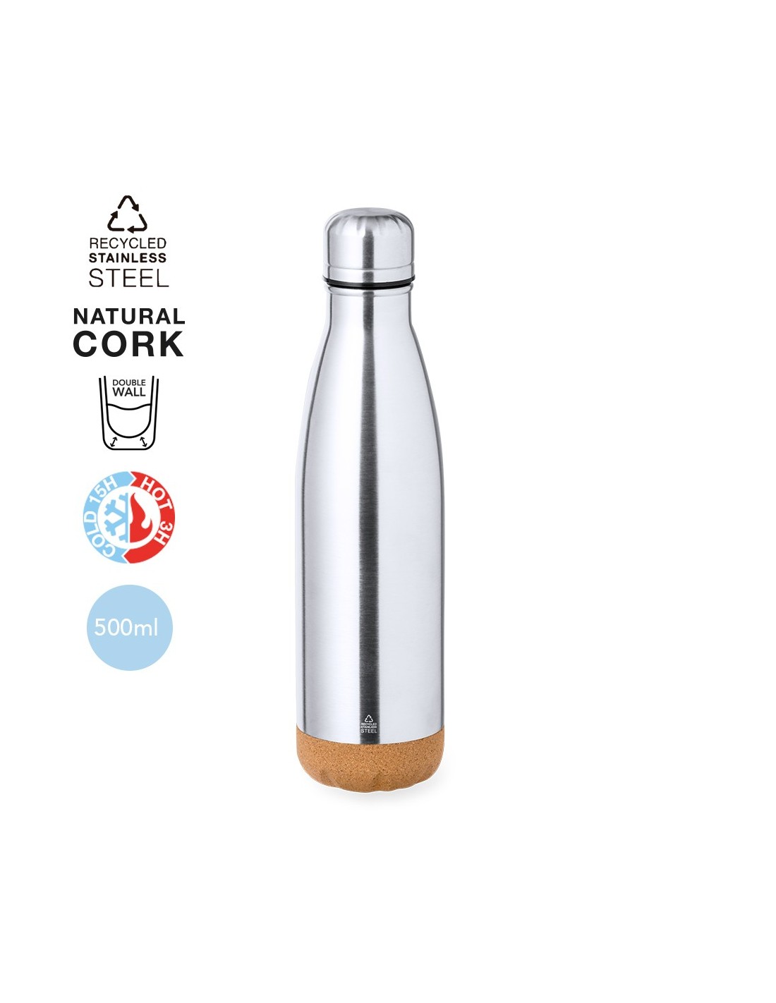 Bidón térmico de doble capa en Acero Inox Reciclado en 500 ml de capacidad. De acabado plata, con tapón a rosca a juego y base en corcho natural. Con logotipo Acero Inox Reciclado, libre de BPA y presentado en caja individual de diseño kraft..El acero es uno de los materiales más demandados y que puede encontrarse casi en todas partes, desde productos de uso diario a grandes construcciones. Con innumerables propiedades, entre las que cabe destacar la durabilidad y su alto grado de reutilización, convirtiéndolo en una alternativa muy valorada en soluciones de sostenibilidad. Debidamente tratado, permite obtener nuevos recursos de infinita utilización.