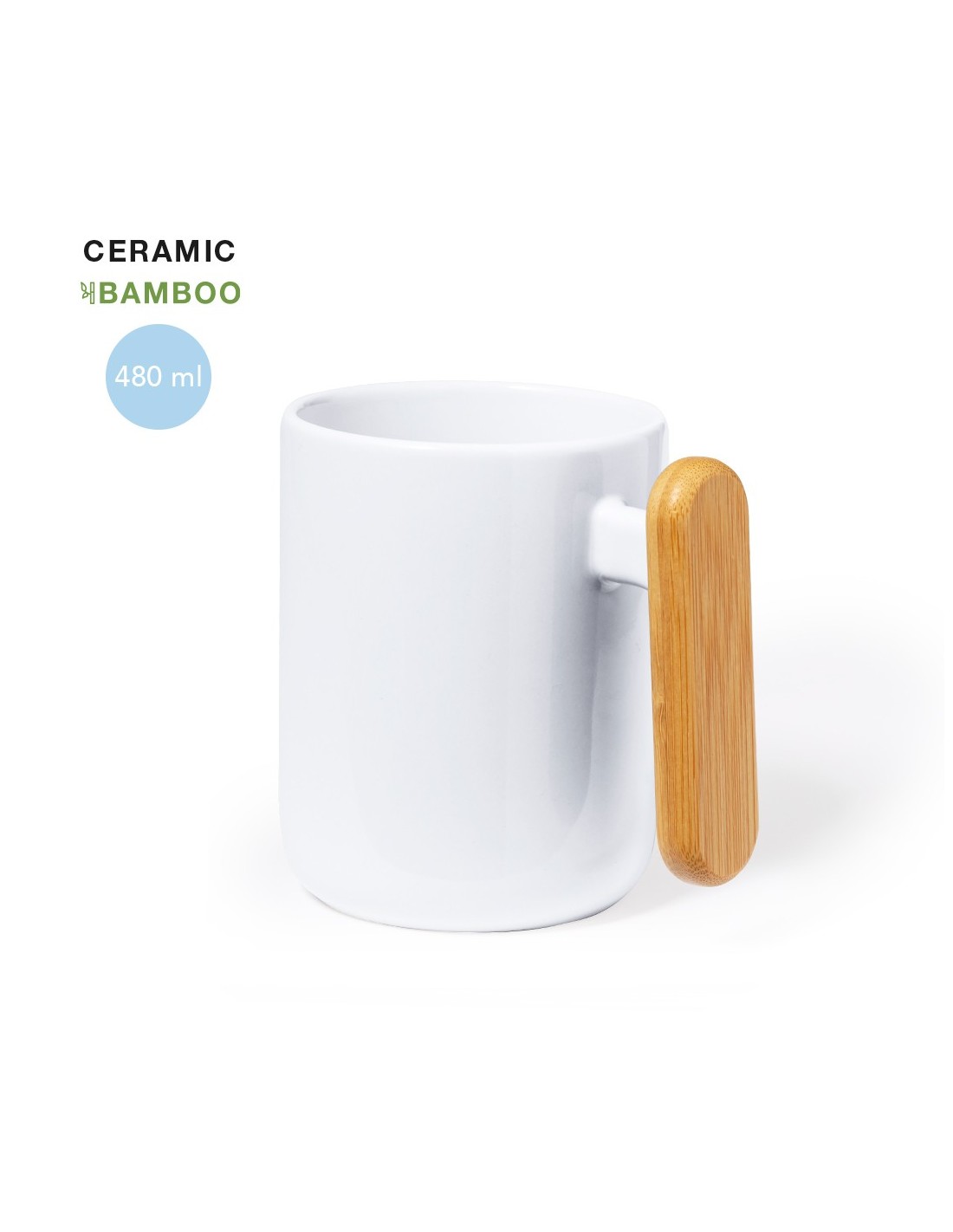 Taza de cerámica de 480 ml de capacidad, en elegante color blanco. Distinguido diseño en combinación cerámica con asa de bambú. Presentada en caja individual acabado kraft..Materiales como el bambú fomentan la utilización de materias primas naturales, reduciendo las emisiones contaminantes. Proviene de una planta de gran resistencia y versatilidad, con crecimiento y regeneración rápidos, siendo una excelente alternativa al uso de madera tradicional.
