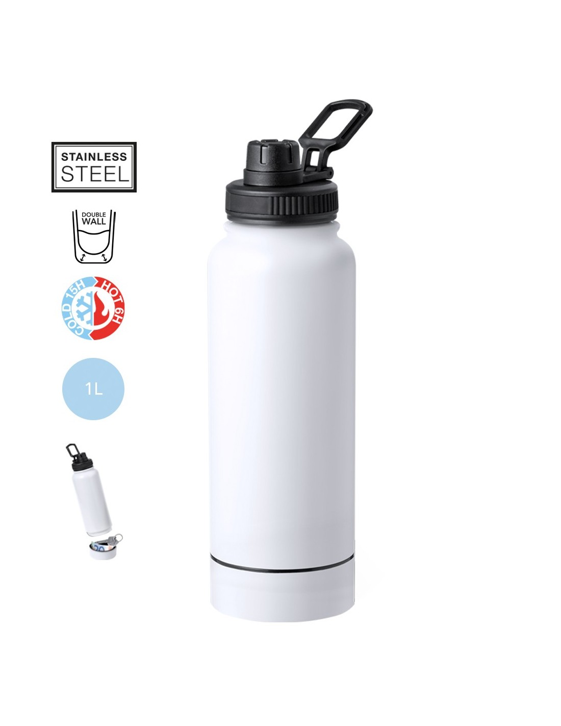 Bidón térmico de doble capa con 1L de capacidad en acero inox. Tapón de rosca de color negro con dosificador y asa de transporte. Además, en la base tiene un compartimento de rosca para guardar pequeños objetos. Disponible en elegantes colores. Presentado en caja de diseño kraft.